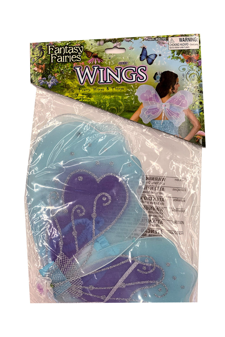 Ces ailes se distinguent par leur structure légère en fil de fer souple et leur revêtement en tulle irisé bleu. Leur envergure de 45 cm permet un rendu spectaculaire sans entraver vos mouvements.