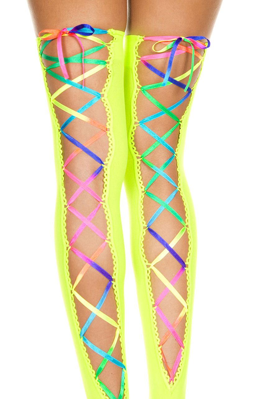 Apportez une touche audacieuse à votre tenue avec ces bas auto-fixants vert néon à lacets arc-en-ciel, conçus pour maintenir votre style toute la journée.