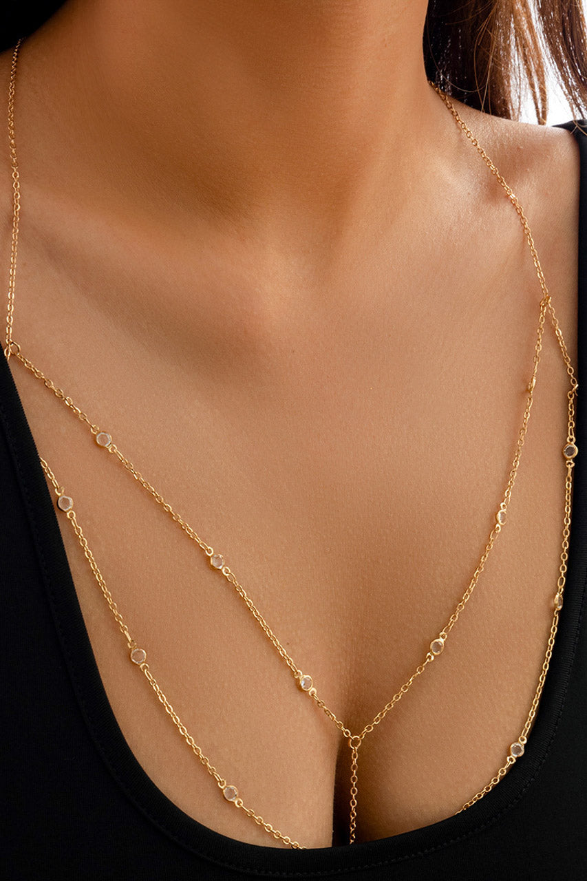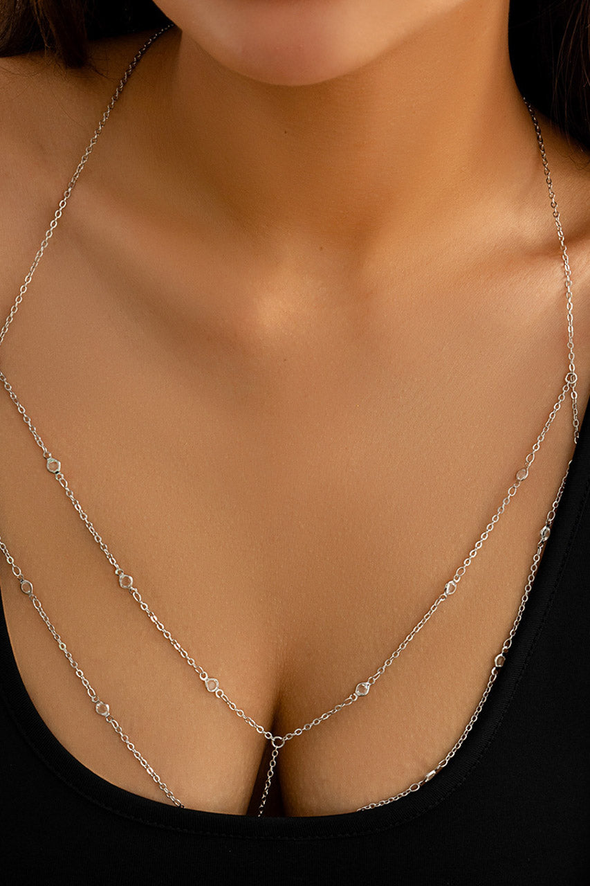 Le bijou de corps en chaîne drapée s’adapte à toutes les morphologies grâce à son design modulable et souligne la silhouette avec élégance.