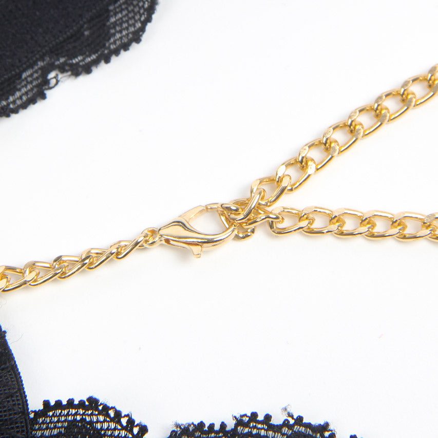 La dentelle fine souligne légèrement les bords du décolleté, créant un jeu de transparence subtil. Les bonnets sont soutenus par des chaînes délicates, apportant une touche rock-chic sans surcharger la pièce.