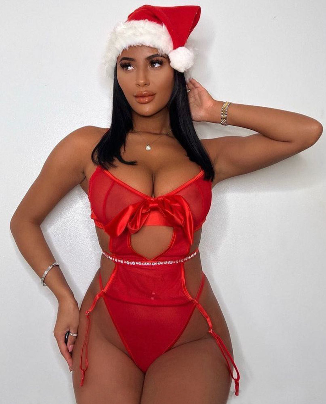 Ce teddy rouge intense reprend les codes iconiques de Mère Noël en ajoutant une touche sensuelle grâce à sa découpe en mesh sur le buste.