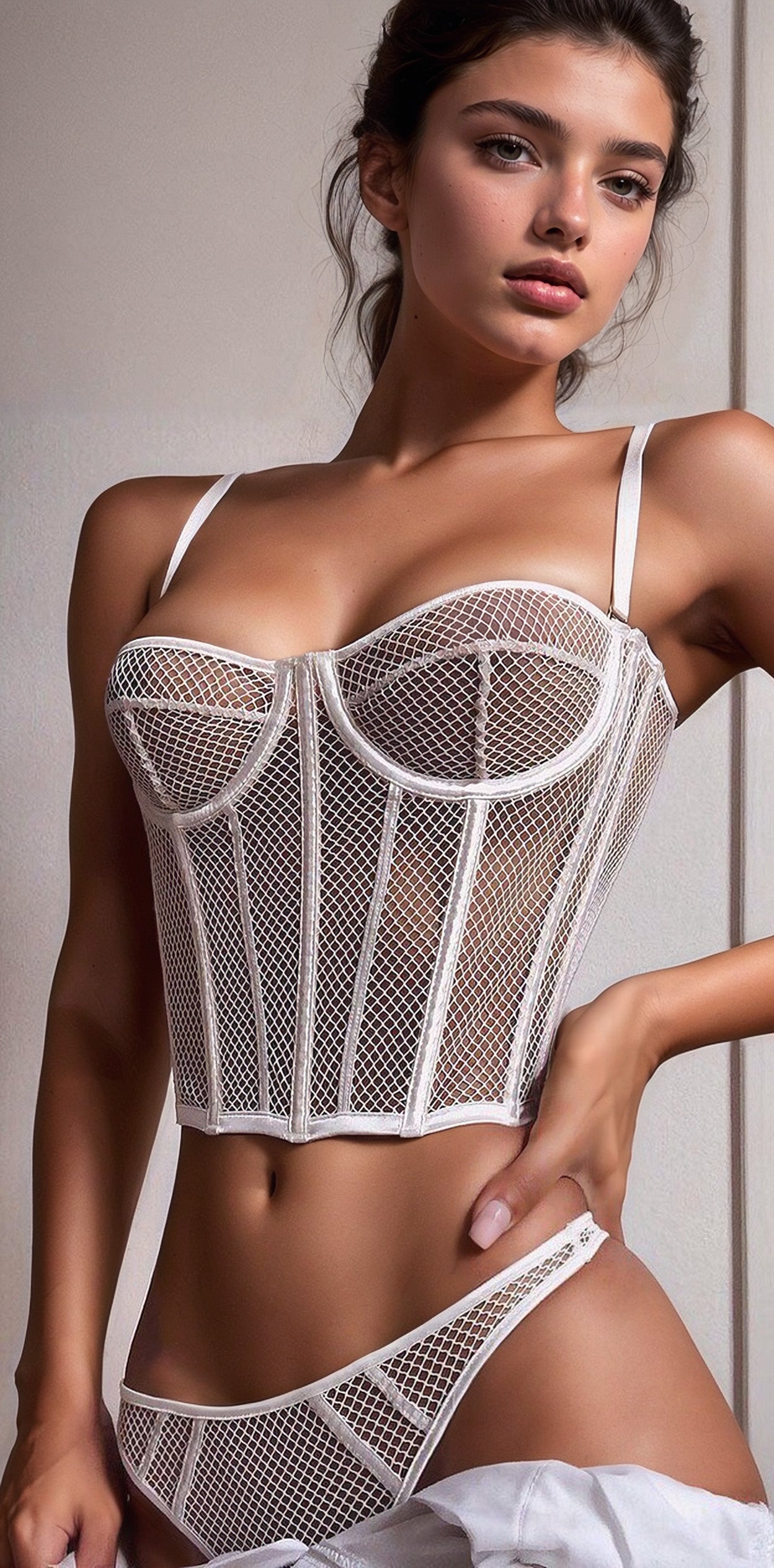 Le bustier en filet blanc à armatures réunit audace et maintien pour sublimer la silhouette sans compromettre le confort.