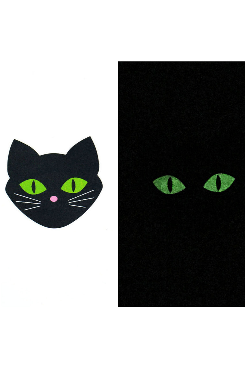 Le motif évoque la silhouette d’un chat noir avec des yeux verts étincelants, idéal pour soirées à thème, festivals ou séances photo originales.
