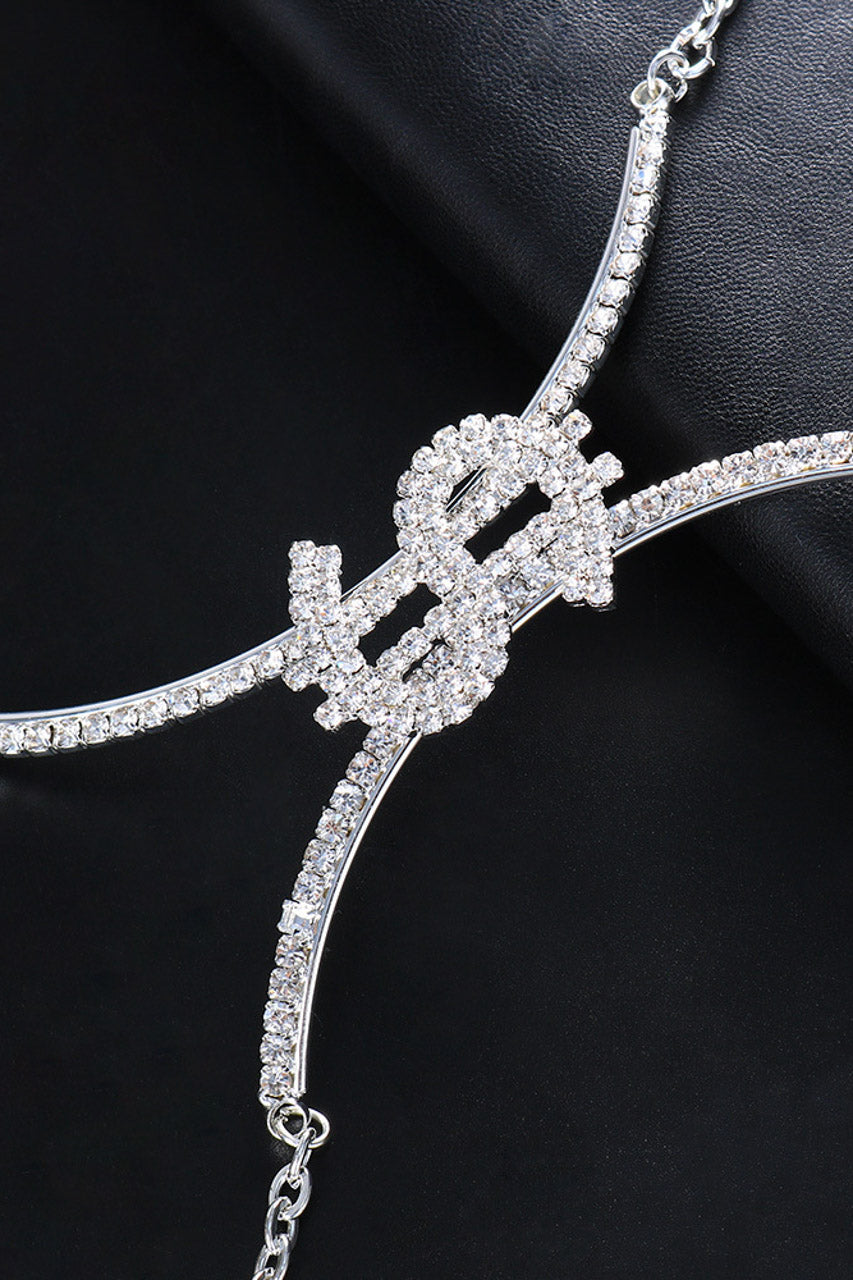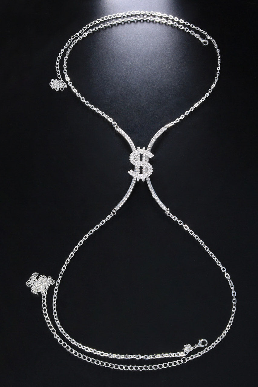 Ce body chain s’attache facilement autour du buste et de la taille grâce à son fermoir réglable, garantissant un ajustement parfait pour toutes les morphologies. Le charm en forme de signe dollar ajoute un détail raffiné et original.