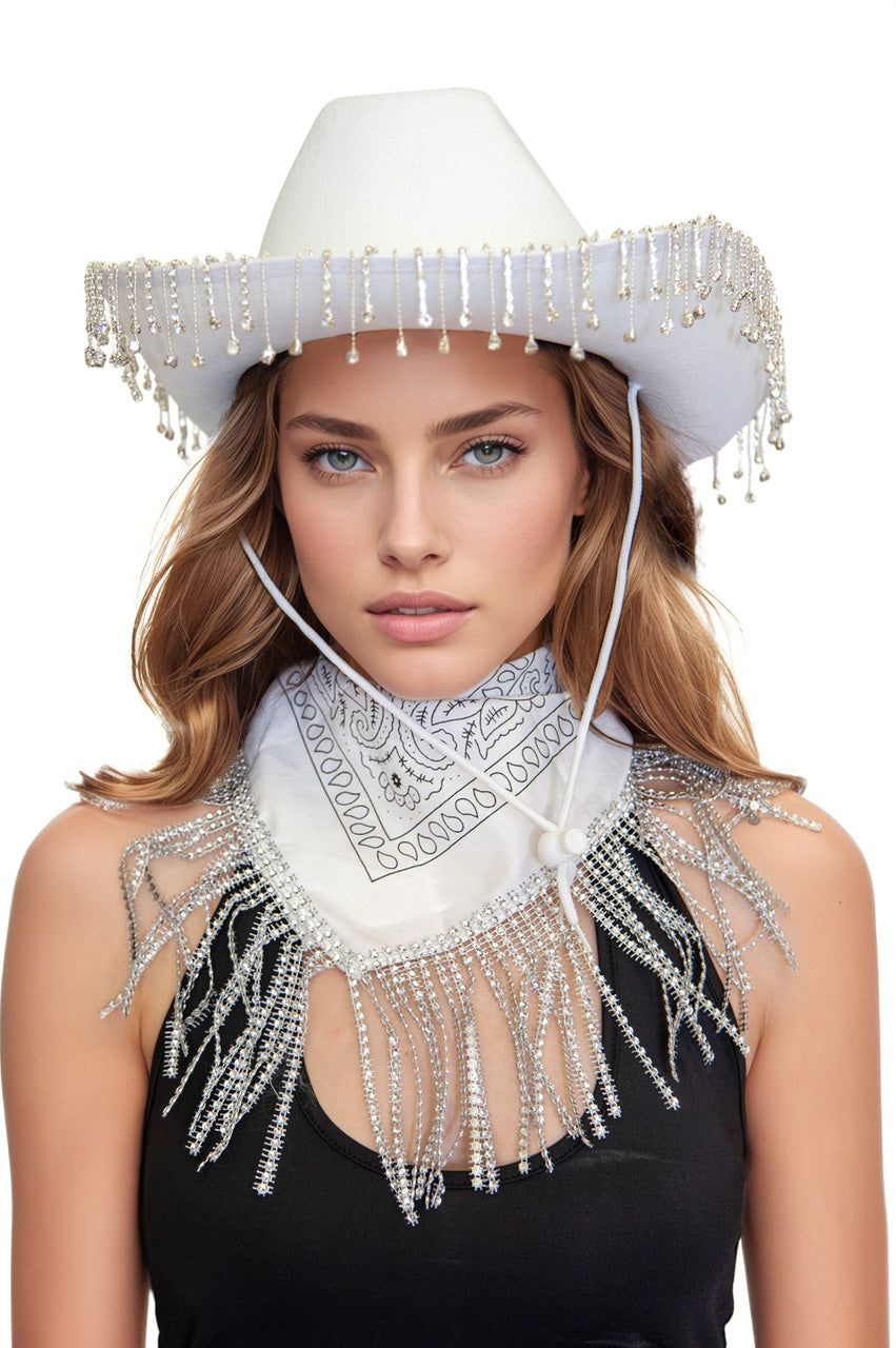 Allure unique dans un style western revisité, ce chapeau cowgirl blanc et son bandana à sequins apportent légèreté et caractère à vos tenues.