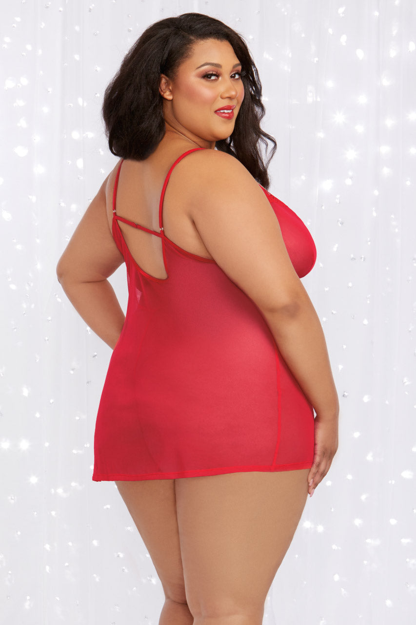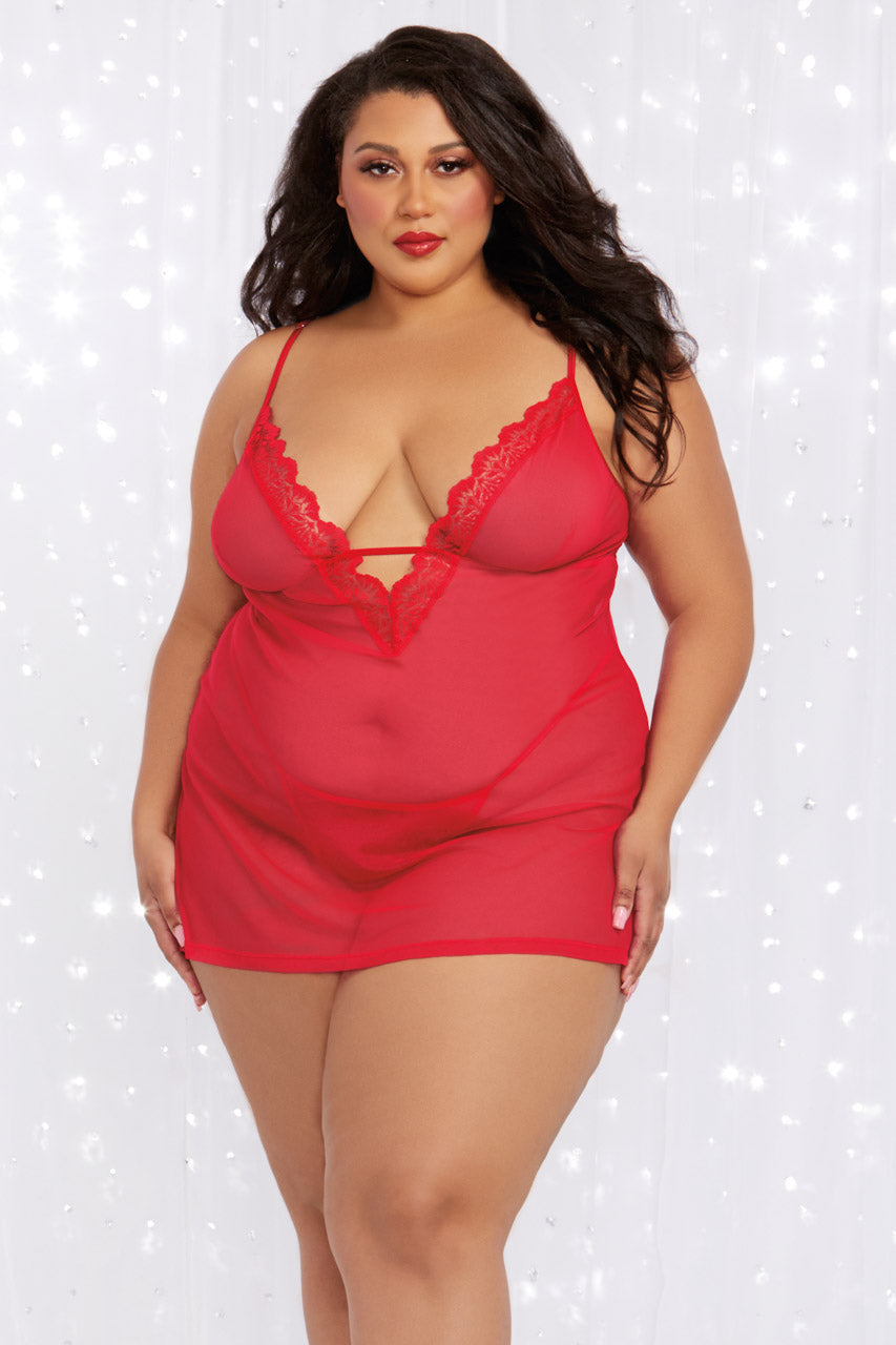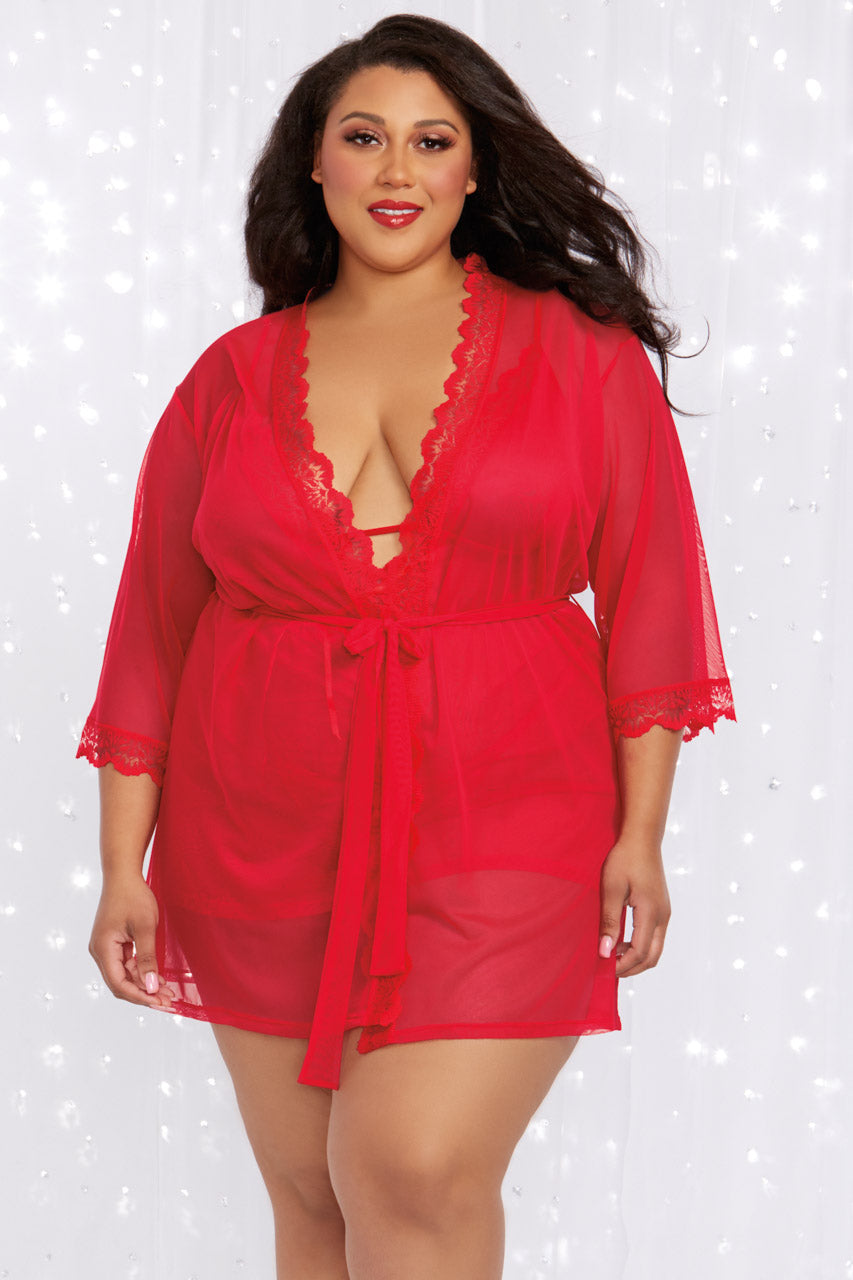 Laissez-vous séduire par la Chemise et robe rouge grande taille en mesh et dentelle, associant élégance et confort. La chemise en mesh rouge profond, rehaussée d’un bord en dentelle, s’accorde à la robe fluide ceinturée à la taille pour structurer votre silhouette.