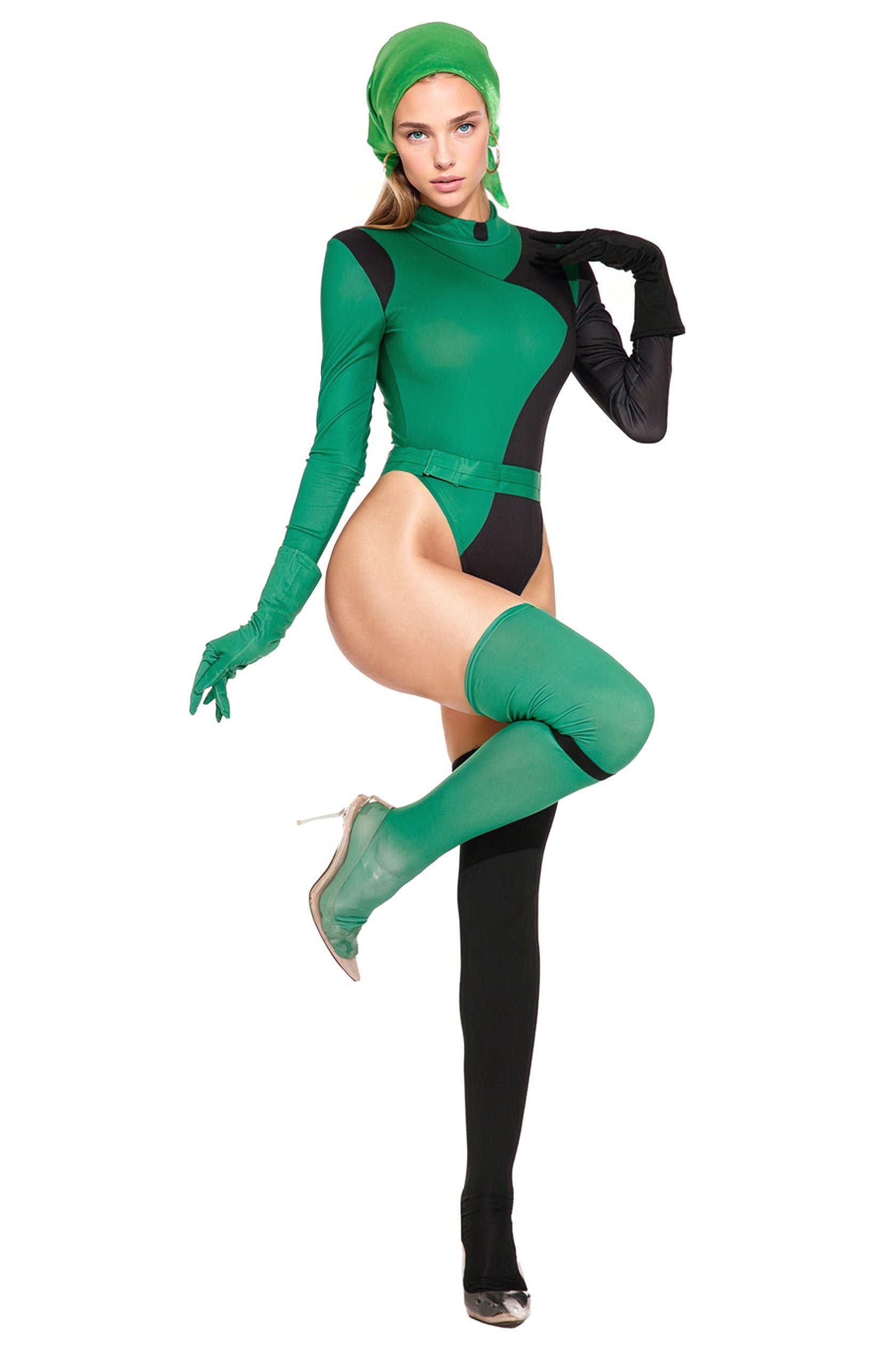 Le motif noir et vert apporte une touche moderne à ce déguisement femme, parfait pour vos soirées à thème ou événements cosplay.