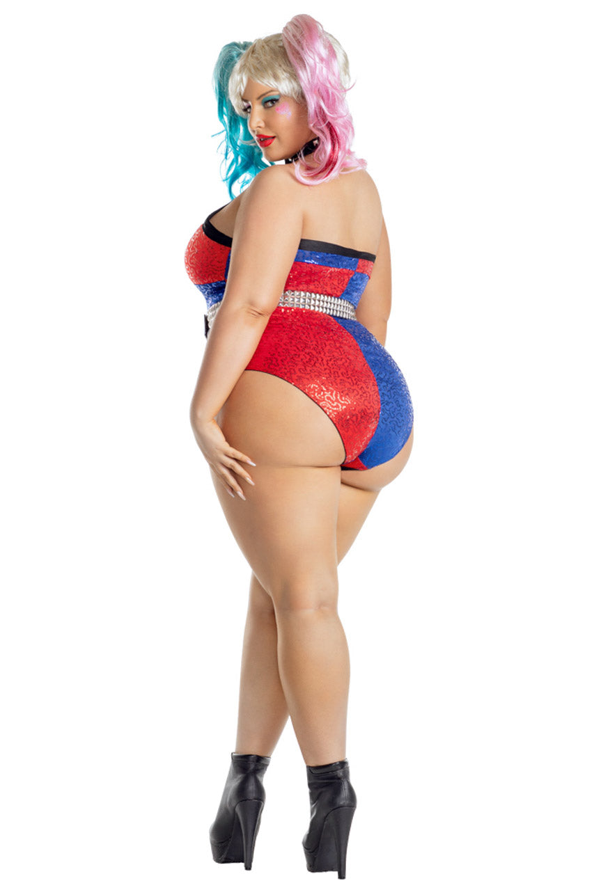 La combishort grande taille Suicide Gal scintillant mêle l’audace d’un costume Sexy Suicide Gal avec une coupe adaptée aux silhouettes généreuses. Conçue pour offrir un look glamour, elle capte la lumière grâce à ses paillettes rouges et bleues. Cette combinaison courte se distingue par un décolleté plongeant, un tour de cou assorti et une ceinture qui souligne la taille. Les accessoires tels que la perruque, les bas et les chaussures sont vendus séparément pour personnaliser votre tenue.