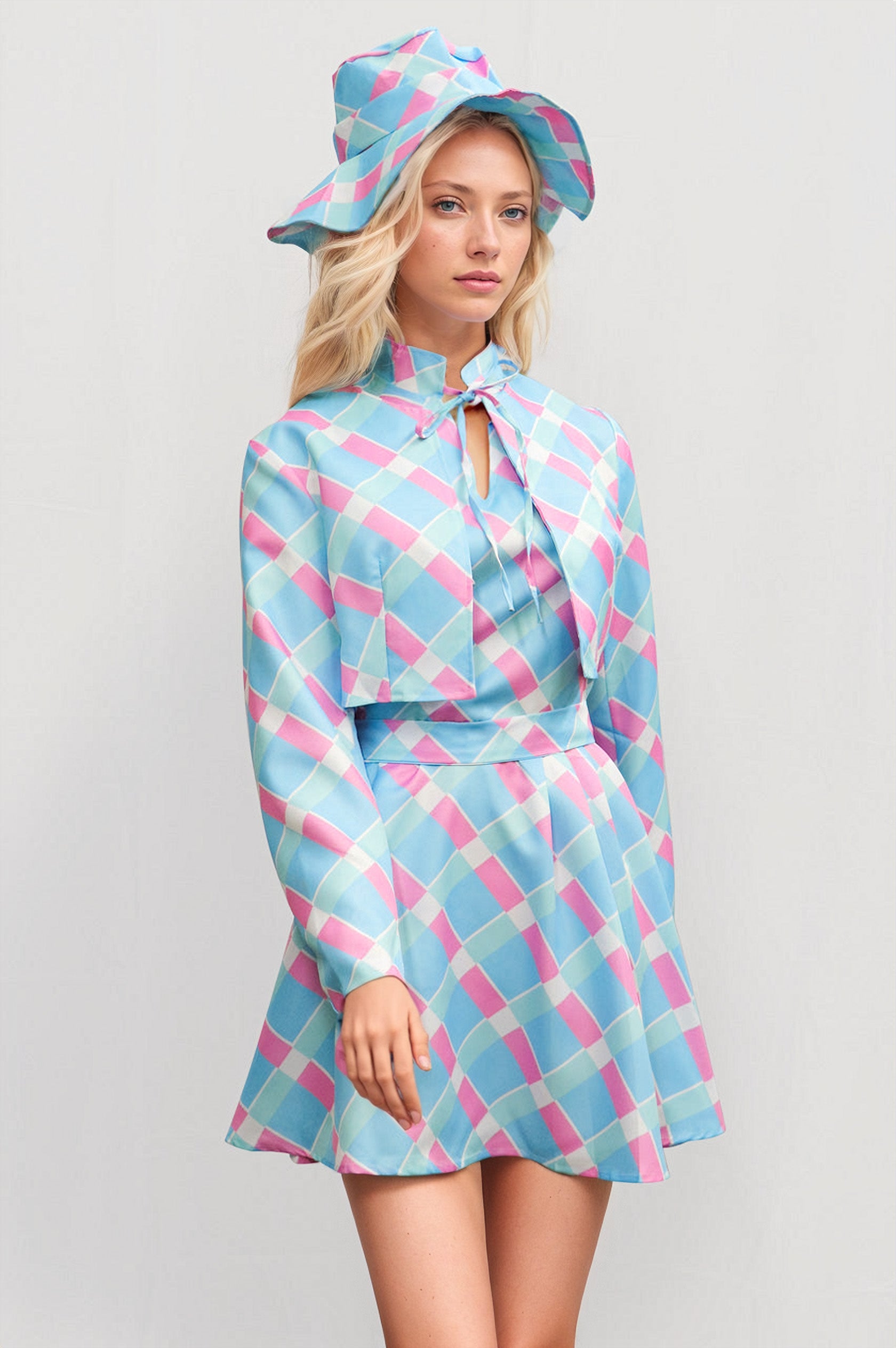 La robe en tissu doux présente un imprimé géométrique bleu qui évoque l’esprit de l’exploration. Le manteau offre une finition soignée grâce à son fermoir au col, tandis que la ceinture souligne la taille avec précision. Le chapeau garantit une allure authentique et protège légèrement du soleil.