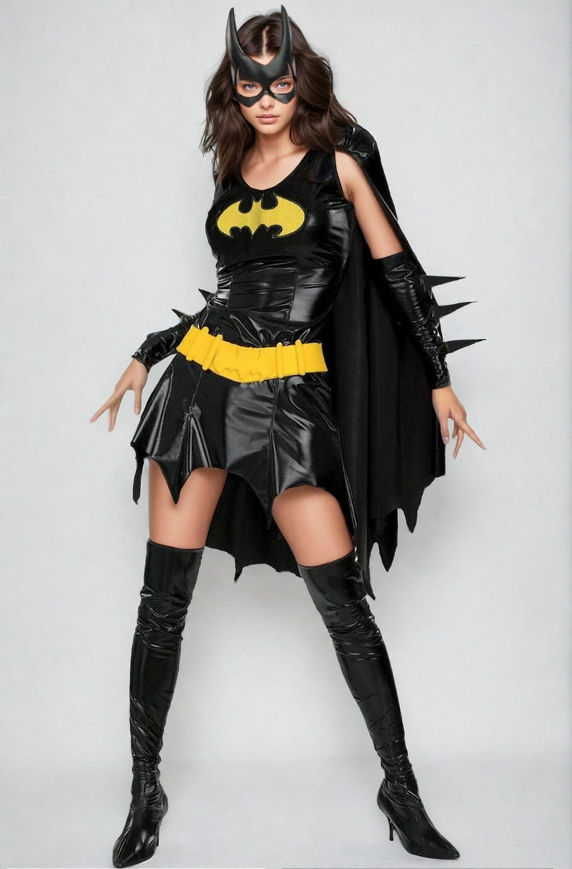 La robe mini présente un décolleté arrondi et une jupe à bords découpés en forme d’ailes de chauve-souris. Les gantelets, inspirés de l’équipement de Batgirl, prolongent l’esthétique super-héroïque. Le contraste noir et jaune renforce le caractère moderne du costume.