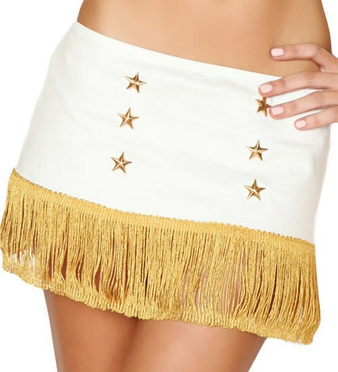 - Jupe courte blanche munie de galons frangés et d’étoiles dorées.