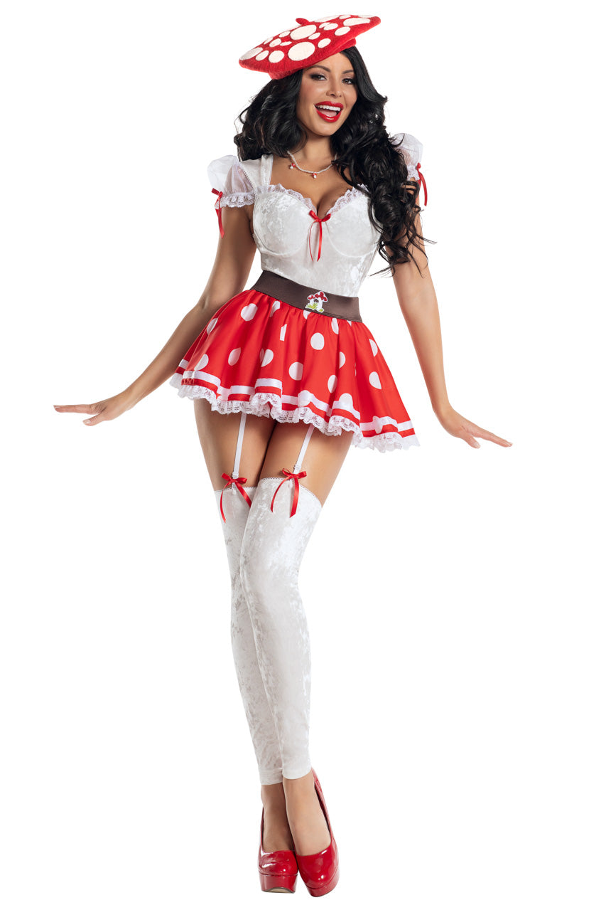 Le Costume champignon Cutie propose un teddy en velours froissé blanc associé à des manches ballon en tulle pour une silhouette légère. Les bretelles garters sont intégrées et surmontées de rubans rouges pour souligner la taille. Une jupe à pois avec patch champignon apporte une touche fantaisie. Le chapeau assorti et les jambières complètent ce déguisement original et confortable.