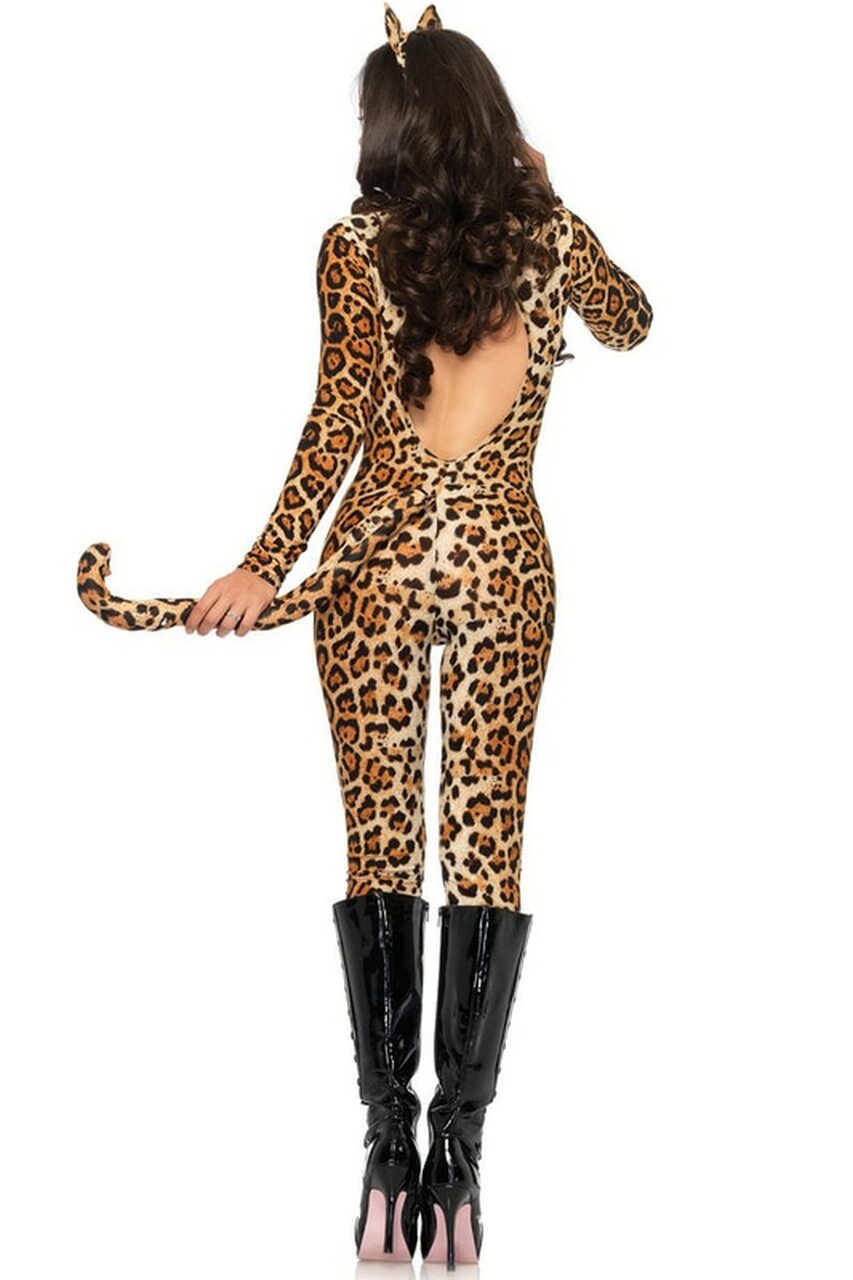 Le body imprimé animal propose une coupe ajustée avec des manches longues et un décolleté dos en goutte d’eau. La queue fixée apporte une note réaliste, tandis que le serre-tête à oreilles souligne l’ambiance féline. Le collier clouté, orné d’un pendentif en forme de cœur, vient parfaire l’ensemble.