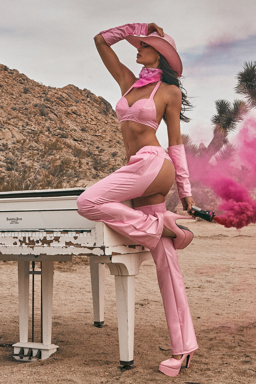 Ce déguisement se compose de six éléments parfaitement agencés : un soutien-gorge en vinyle rose à bretelles halter et lien à nouer, une culotte à scrunch back, des chaps en vinyle assortis, une ceinture à franges, des manchettes décoratives et un bandana rose. (Chapeau non inclus.)