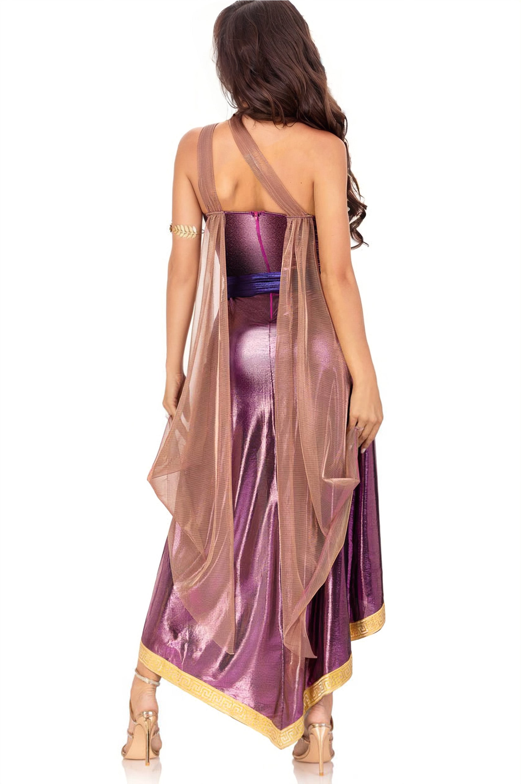 Cette tenue inspirée de la divinité antique transforme toute soirée en moment mémorable. La robe aux reflets pourpres se drape sur une seule épaule, tandis que les découpes et les finitions dorées soulignent chaque courbe.