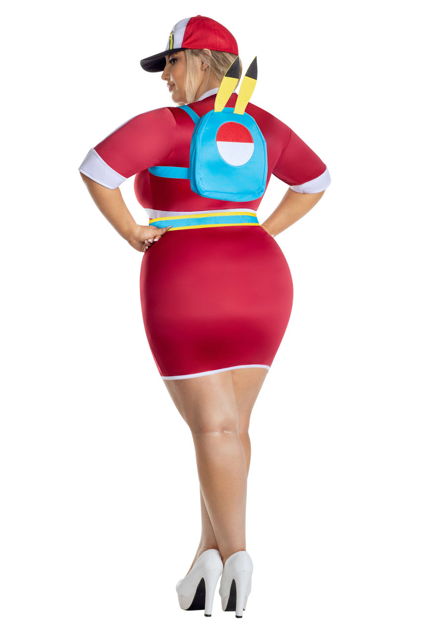 Offrez-vous un costume dresseuse de monstre grande taille idéal pour animer vos soirées costumées. La mini robe rouge, rehaussée de bordures blanches et bleues, s’accompagne d’un sac à dos thématique et d’une casquette assortie, pour un style cohérent jusqu’au dernier détail.