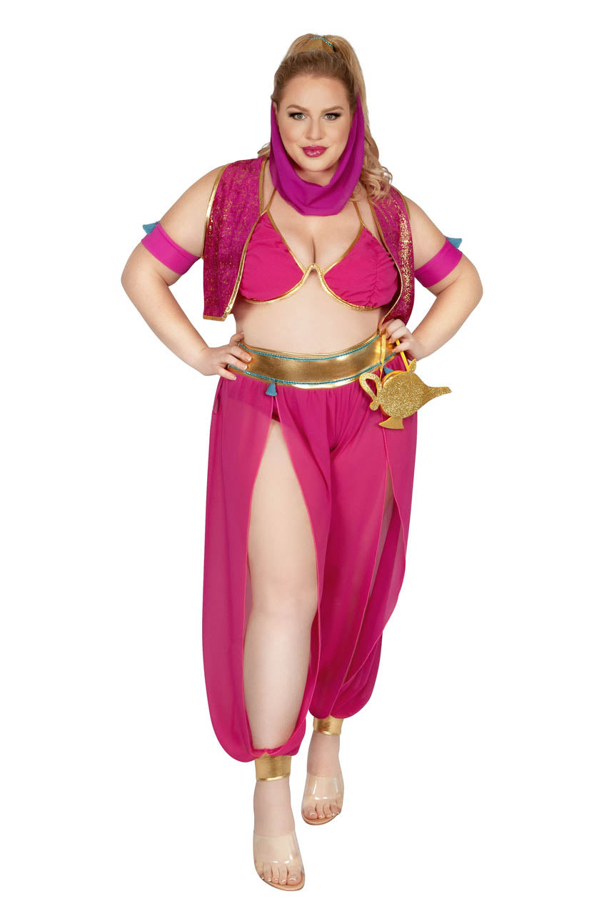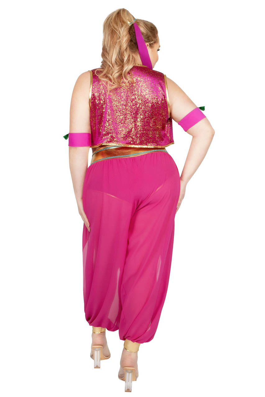 Ce Costume grande taille Génie de la Lampe offre un rendu majestueux grâce à son gilet en velours foil or et magenta.
