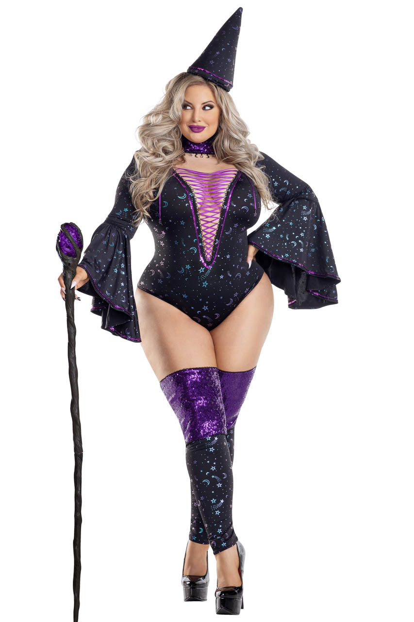 Ce costume grande taille Image of Your Dreams propose un body iridescent à manches cloche, rehaussé de sequins violets pour un rendu scintillant.