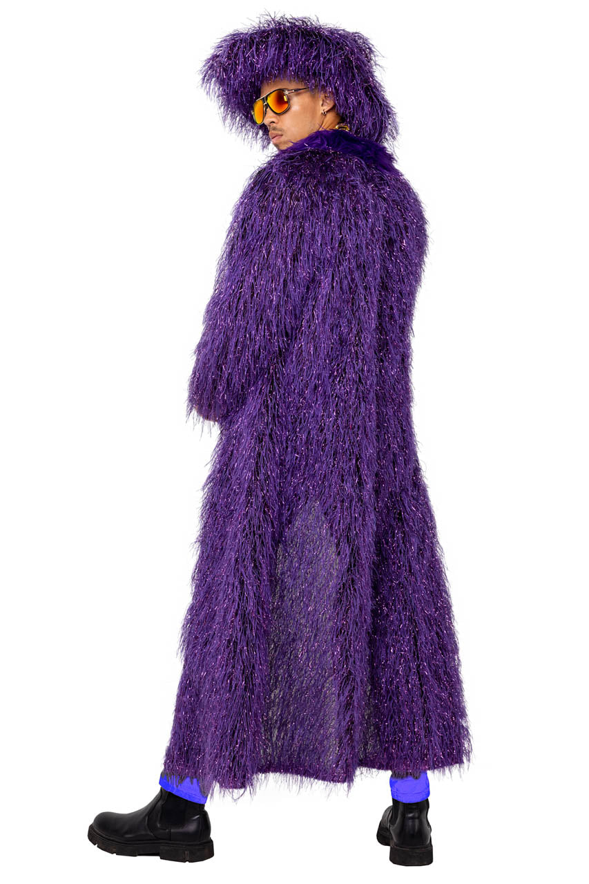 Le manteau en fausse fourrure violette présente une texture douce et soyeuse, rehaussée par un léger éclat. Le chapeau assorti adopte une coupe classique qui souligne le caractère audacieux de cette tenue.