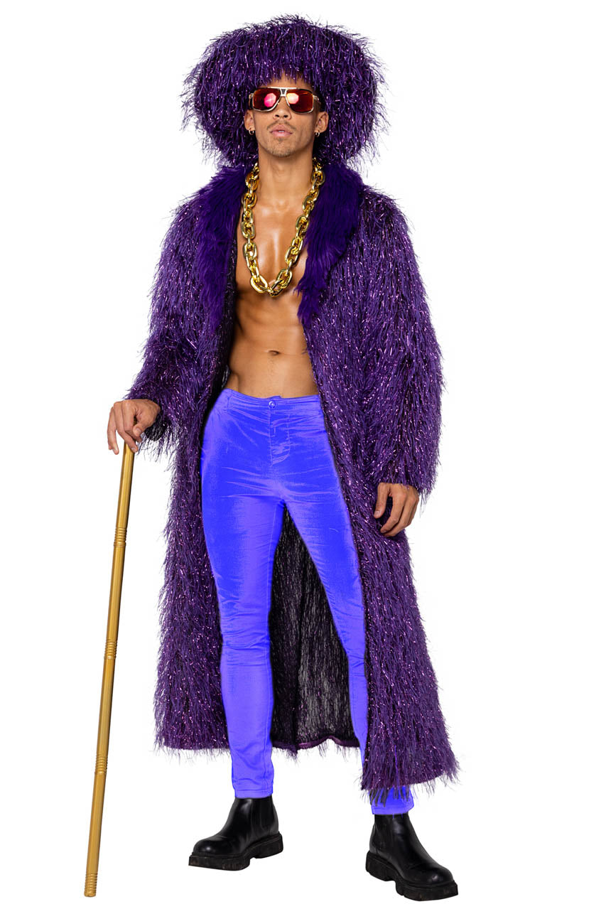Costume high roller homme violet en fausse fourrure offre un ensemble à deux pièces composé d’un manteau scintillant et d’un chapeau assorti, idéal pour surprendre lors d’une soirée casino ou d’un événement festif.