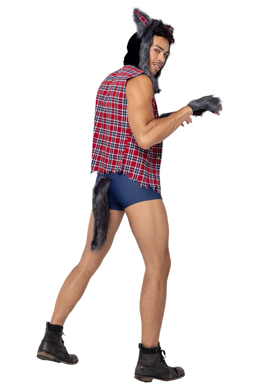 La chemise à carreaux usée est ornée d’une capuche en fausse fourrure, rappelant le pelage d’un loup-garou sous la lumière lunaire.