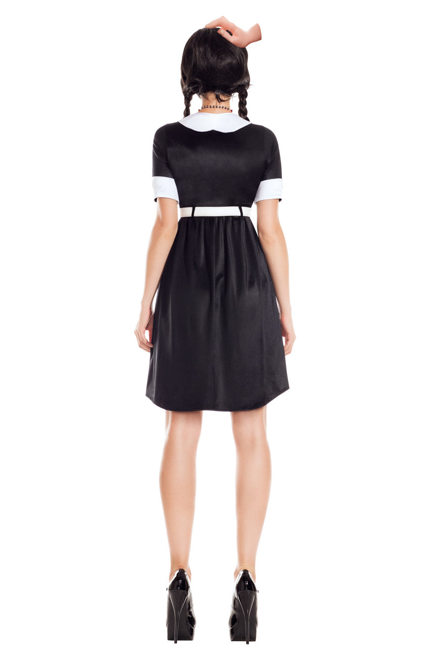 La robe noire présente une coupe asymétrique avec un ourlet court à l’avant et plus long à l’arrière, renforçant l’effet mi-long de cette robe. Les manches blanches créent un contraste chic. La ceinture marquée à la taille souligne la silhouette et la collerette intégrée apporte une touche sophistiquée. Le headpiece assorti termine harmonieusement ce costume sexy.