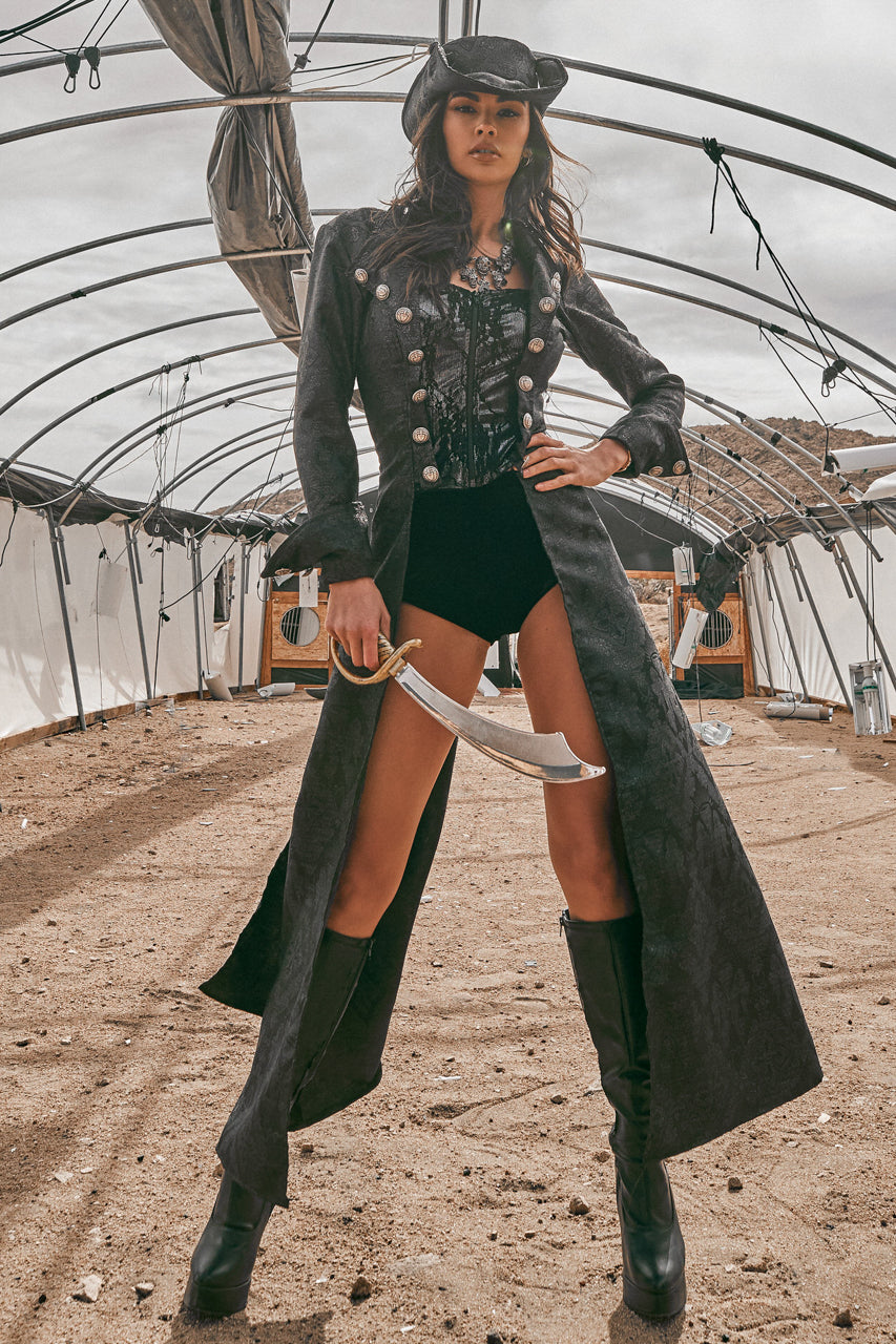 Ce costume pirate captivant 4 pièces réunit des éléments de qualité pour créer une tenue authentique et confortable. La veste longue en brocart affiche de grands boutons décoratifs, tandis que le corset intégré à fermeture éclair assure un maintien optimal. Les shorts offrent une coupe ajustée, le chapeau complète le look et l’épée apporte la touche finale à votre déguisement.