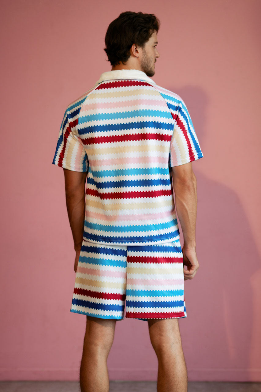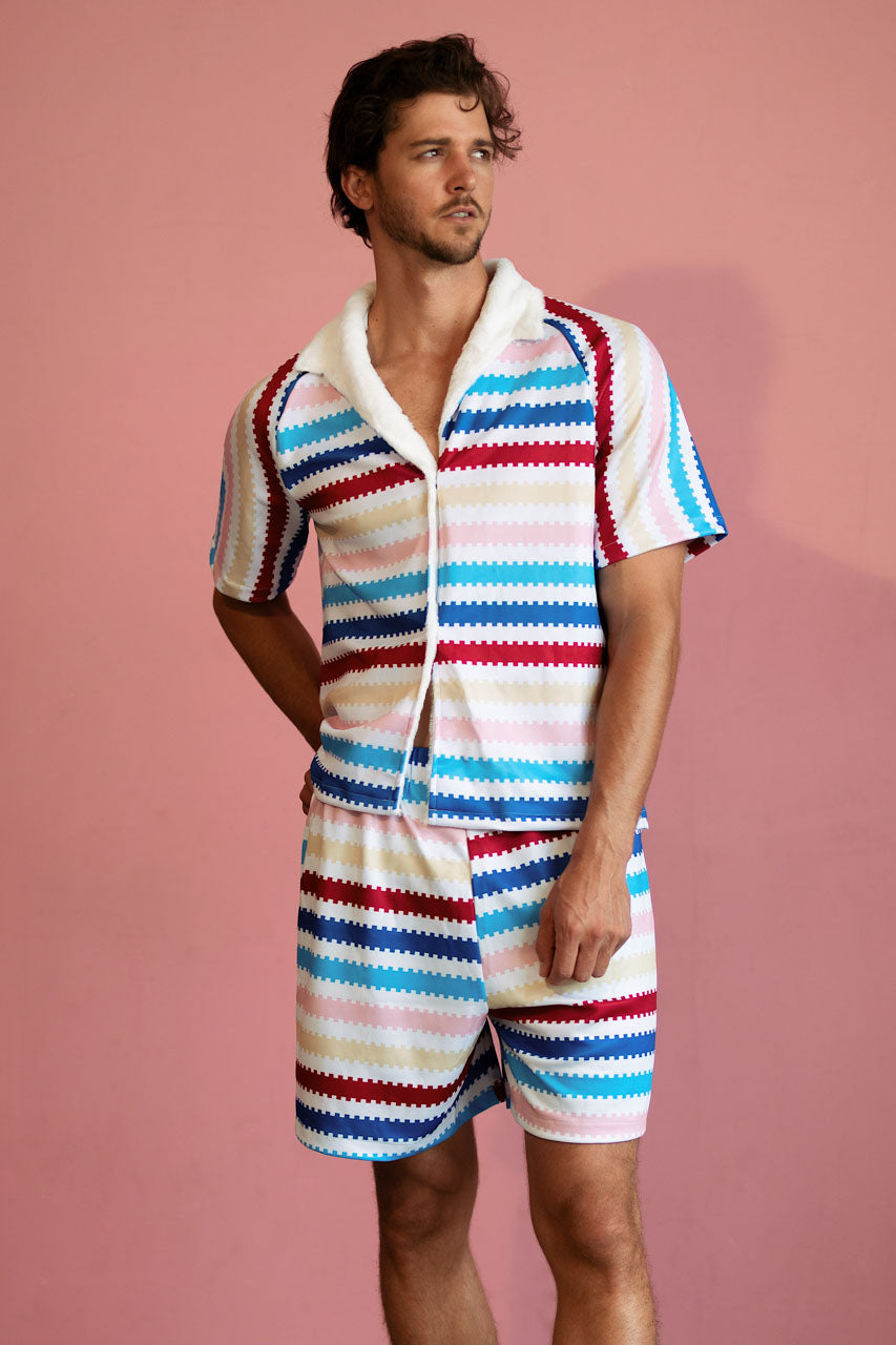 La chemise rayée multicolore intègre une patte de boutonnage centrale facilitant l’habillage. Son col classique se marie avec une bordure en fausse fourrure qui renforce l’esprit « doll » tout en restant confortable. Le tissu, sélectionné chez un fournisseur professionnel, combine souplesse et haute résistance.