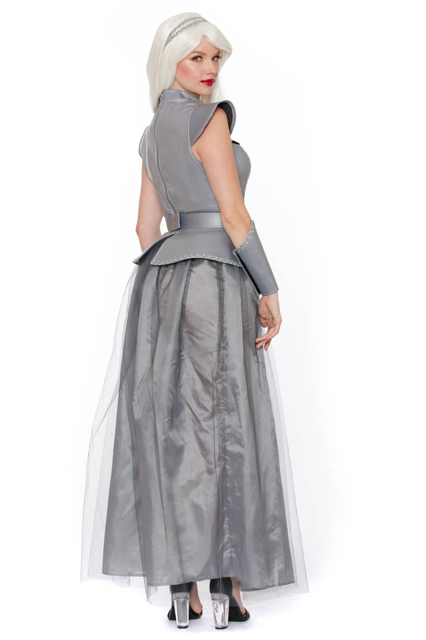 La jupe longue en tulle fluide ajoute une touche aérienne au déguisement reine des dragons.