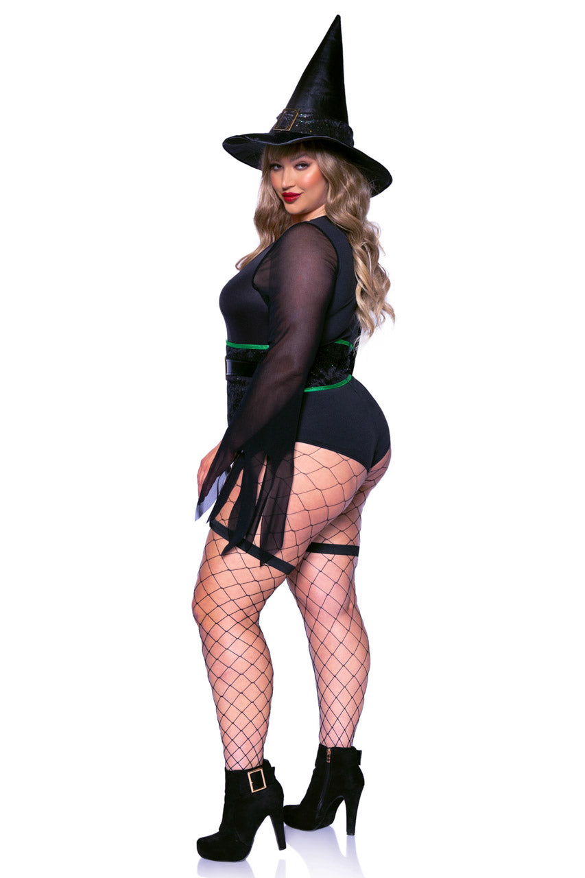 Le costume sorcière grande taille cintré bustier vert provoque un effet saisissant à chaque apparition. Il se compose d’un body noir agrémenté d’un bustier vert à laçage, d’un corset intégré et de manches ornées de découpes irrégulières. Les jarretelles intégrées et le chapeau pointu complètent parfaitement ce déguisement audacieux.