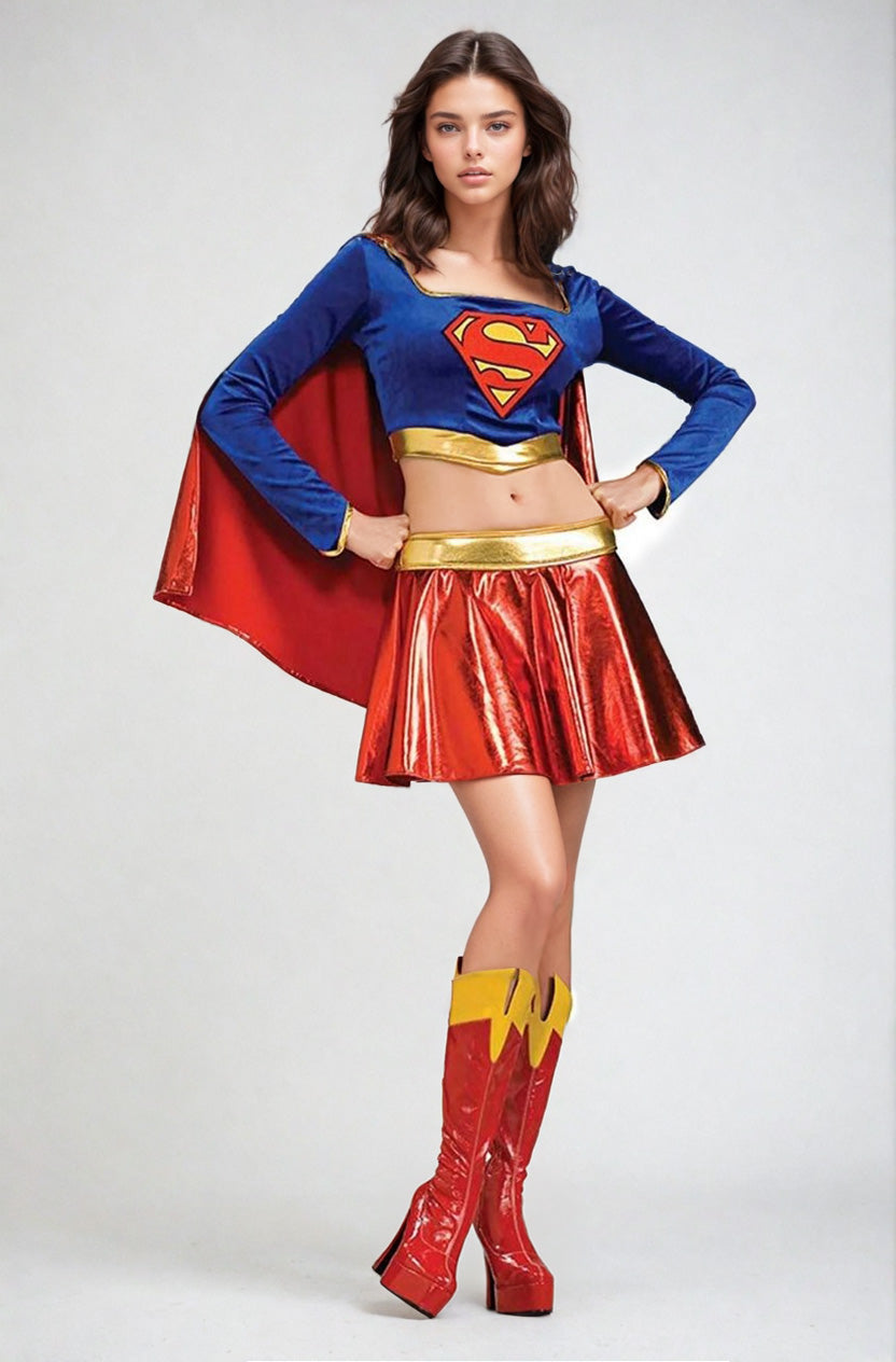 Ce déguisement de super-héroïne associe une coupe moderne à des finitions soignées : un haut bleu dévoilant délicatement le ventre, une cape rouge agrémentée d’un liseré doré pour un look immédiatement identifiable.