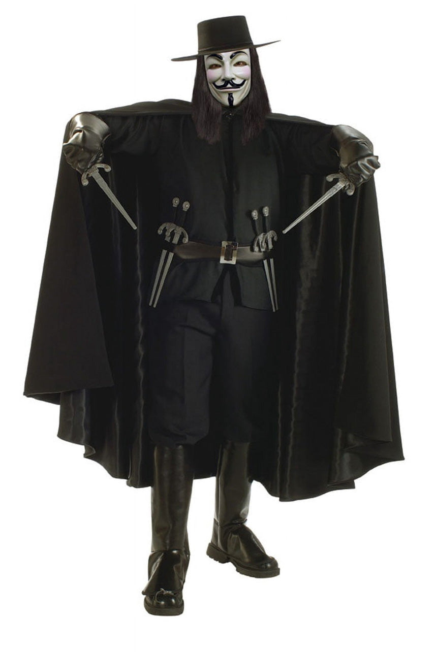 Adoptez un Costume V for Vendetta complet avec masque et cape, idéal pour toute soirée à thème ou manifestation créative. Ce déguisement intègre une chemise ajustée, un pantalon sobre, une cape ample, le masque emblématique de Guy Fawkes, un chapeau haut-de-forme, une ceinture dotée de six dagues fines et des couvre-bottes élégants. Fabriqué à partir de textiles de haute résistance, il offre une tenue confortable même après plusieurs heures.