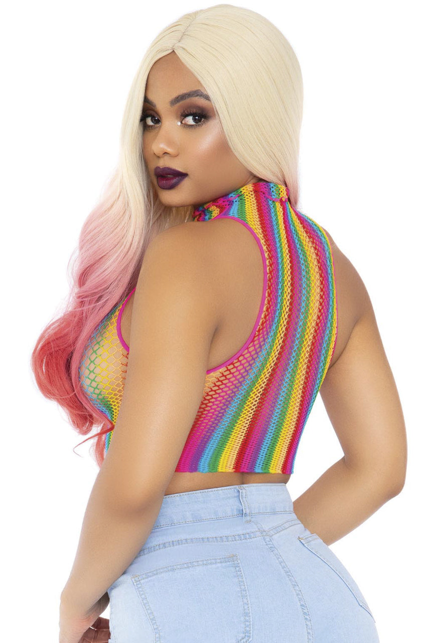 Ajoutez une note audacieuse à votre garde-robe grâce au crop top résille arc-en-ciel col montant, un modèle pensé pour révéler votre style unique.