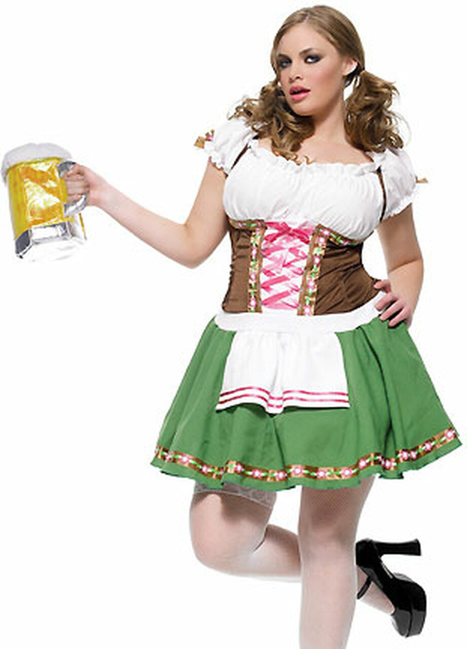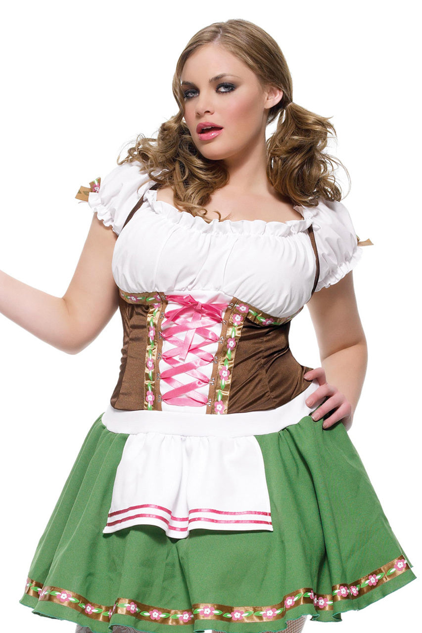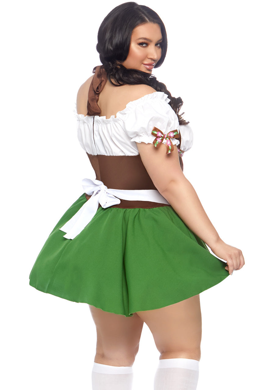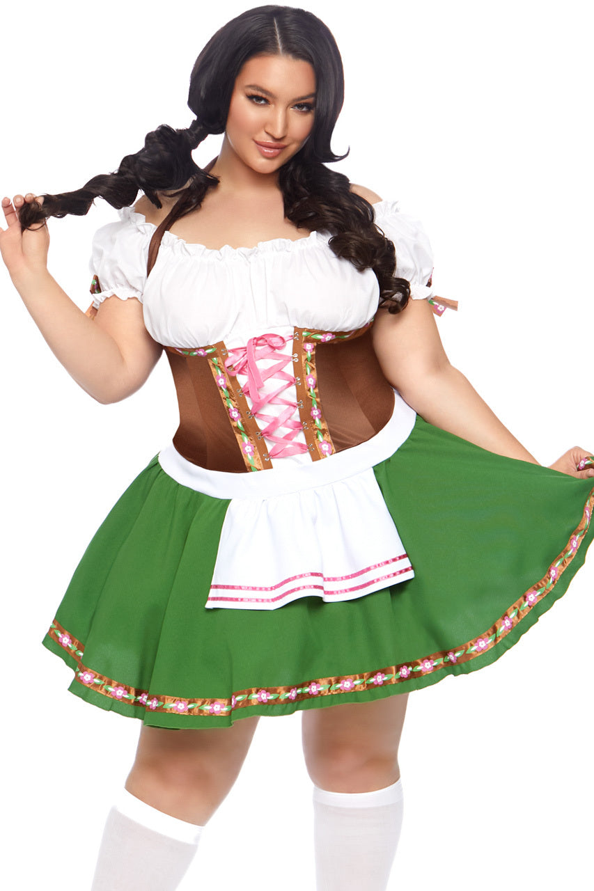 Ce déguisement bière bavaroise grande taille Gretchen propose un style authentique de bière girl agrémenté d’une mini-robe à corset et d’un tablier vert soigné.