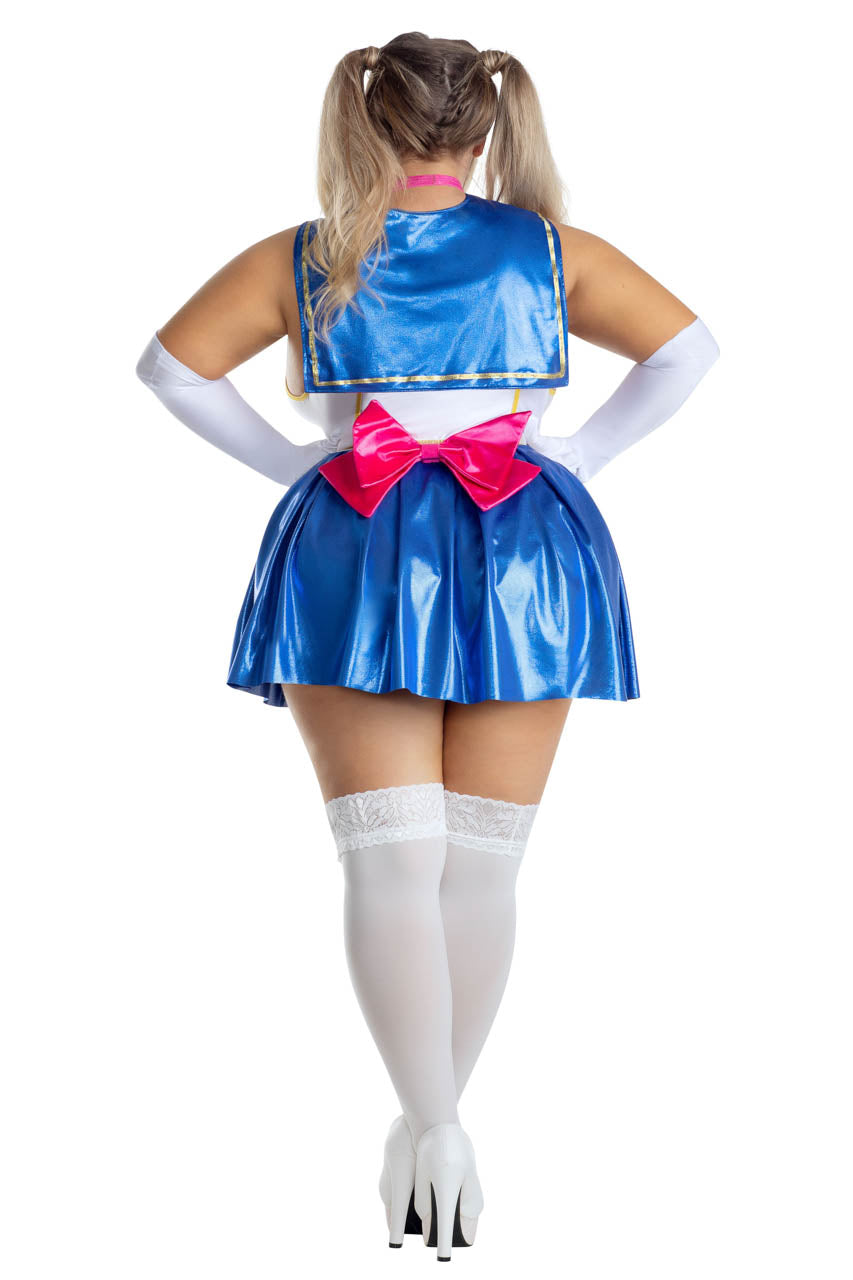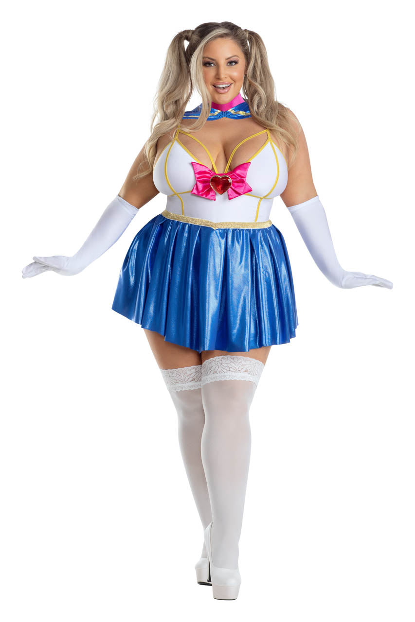 Ce déguisement écolière anime grande taille associe élégance et confort pour un costume fidèle aux codes du manga. Il comprend un romper blanc agrémenté d’un liseré doré, un col marin effet scintillant, une jupe plissée bleue, un nœud rose surdimensionné et des gants longs.