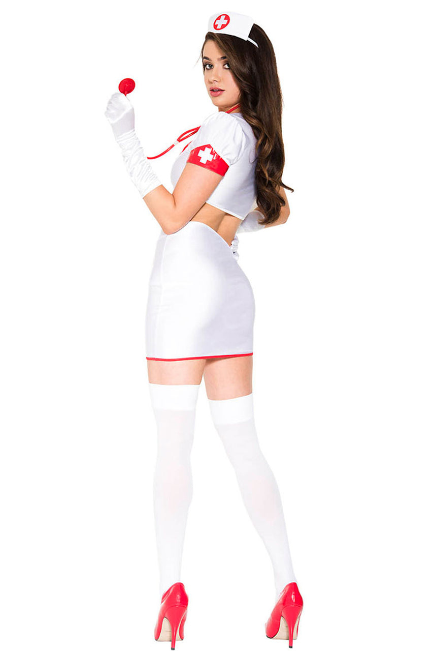 La tenue comprend un top court blanc orné de poches à croix rouges, une jupe taille haute équipée d’un tablier assorti, un serre-tête infirmier, un stéthoscope, des gants blancs et des bas autofixants.