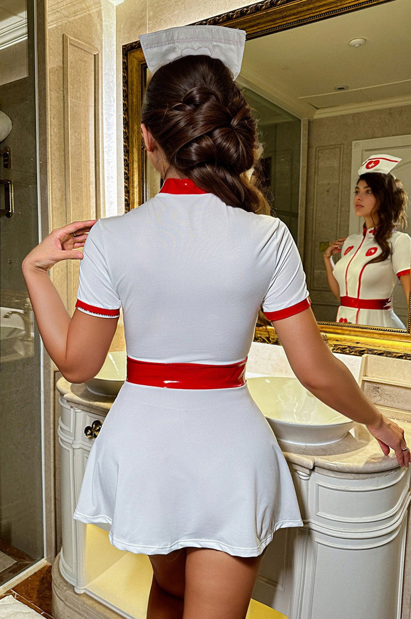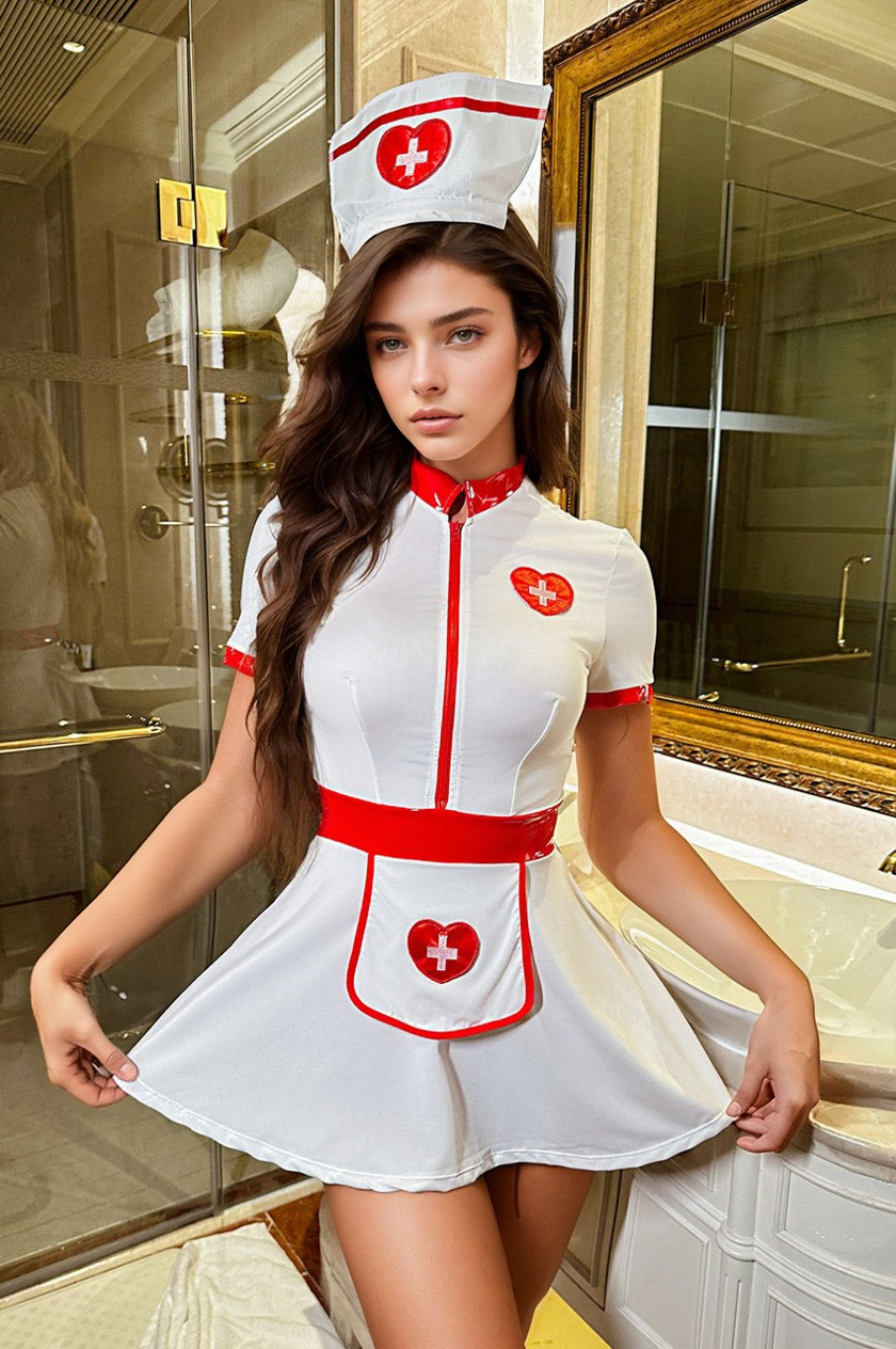 Ce costume « Nurse Me » se compose d’une mini-robe blanche à bordure rouge, d’un col intégré et d’un zip frontal pour un enfilage rapide. Le tablier fixé et les croix infirmière apportent une touche réaliste à ce déguisement infirmière sexy.