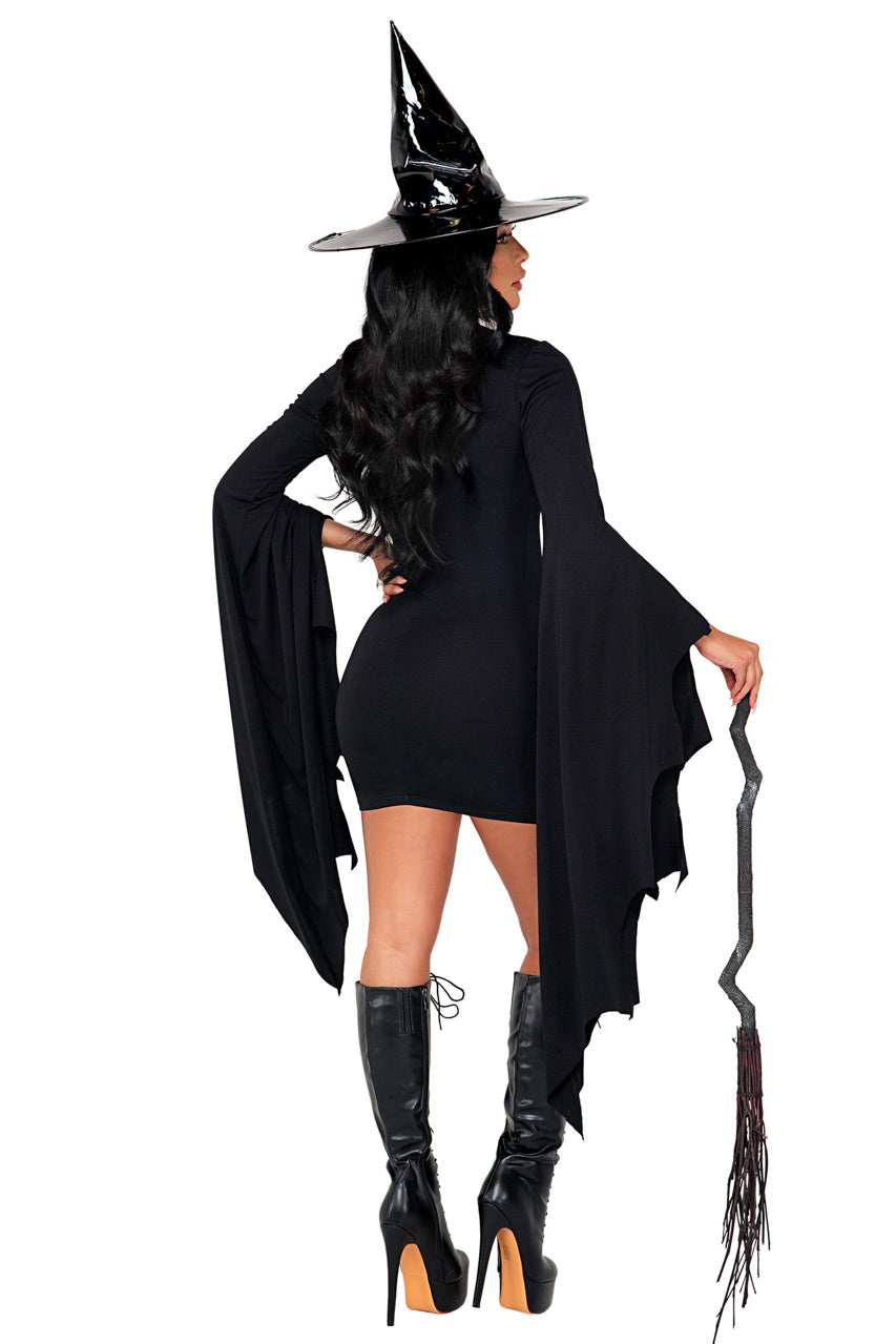 Ce deux-pièces incarne l’esprit mystérieux du coven de minuit pour vos soirées à thème. La robe courte en tissu stretch noir épouse les courbes tout en garantissant une bonne liberté de mouvement. Le laçage au niveau du buste apporte un détail graphique et ajustable selon votre silhouette. Les manches asymétriques à bords irréguliers reproduisent un style ensorcelé, idéal pour un look de sorcière authentique. Le chapeau vinyle assorti offre une touche brillante et structurée à l’ensemble. (Balai non inclus.)