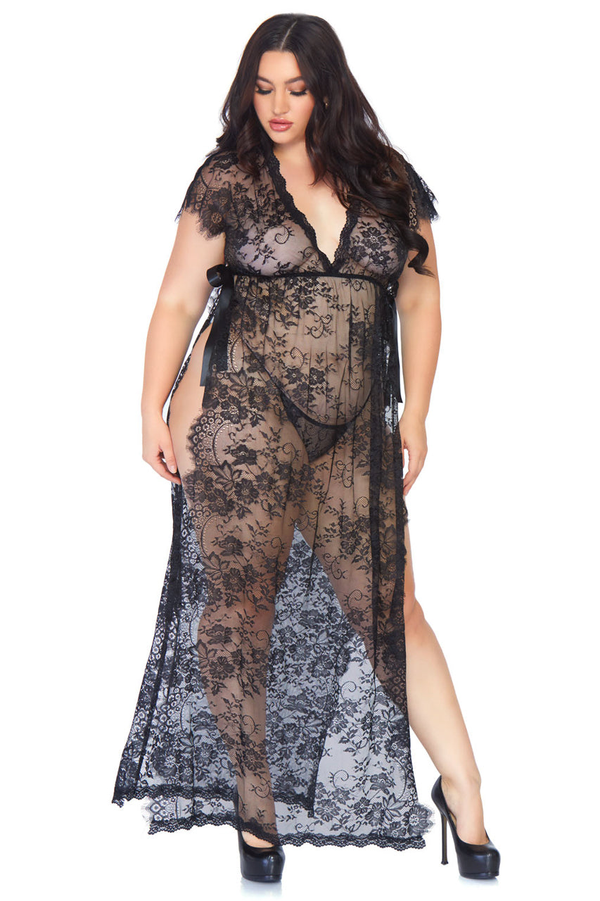 Cette tenue deux pièces comprend une robe en dentelle cils noire, agrémentée de liens latéraux en satin réglables pour un ajustement sur-mesure.