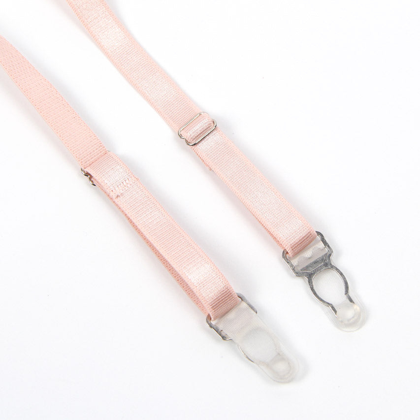 La ceinture porte-jarretelles complète l’ensemble, soulignant la taille avec des plumes légères et aériennes.