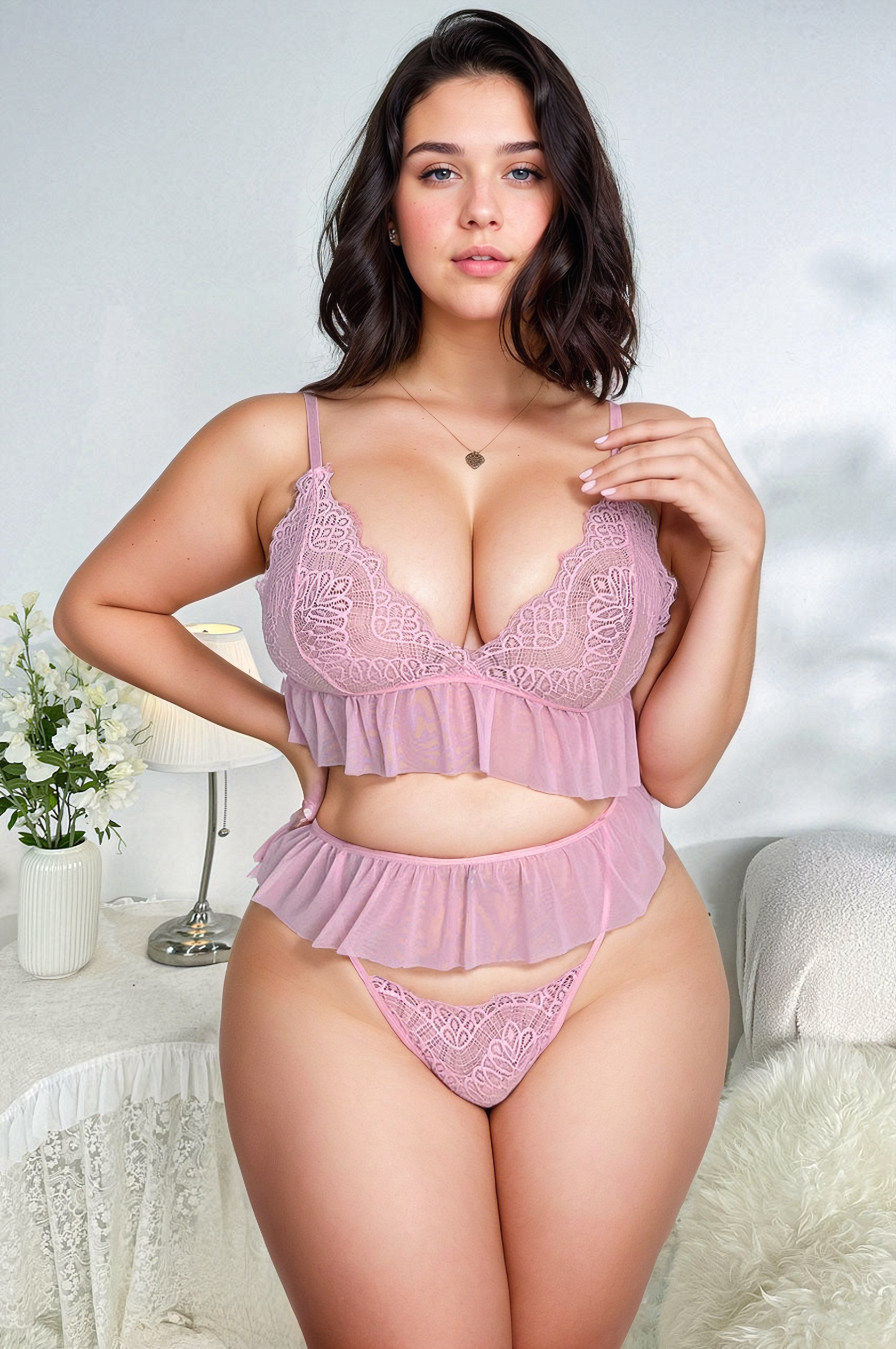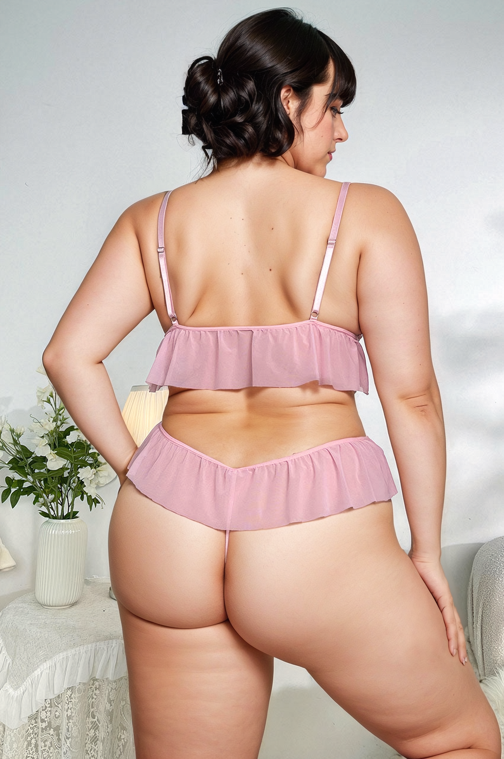 La nouvelle ensemble lingerie grande taille à volants rose met en valeur les courbes et offre un jeu de transparence délicat grâce à sa bralette en dentelle et son jupon de tulle volanté.