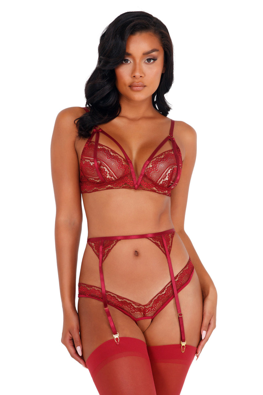 Ce soutien-gorge armaturé propose des découpes précises et des bandes strappy qui soulignent le buste, agrémenté de paillettes discrètes pour un éclat délicat. L’ensemble inclut un porte-jarretelles taille haute et un string ouvert, pensé pour sublimer chaque courbe.