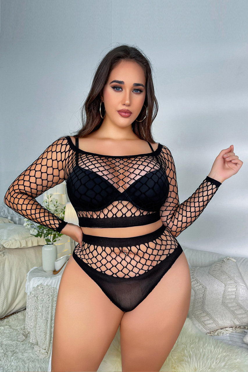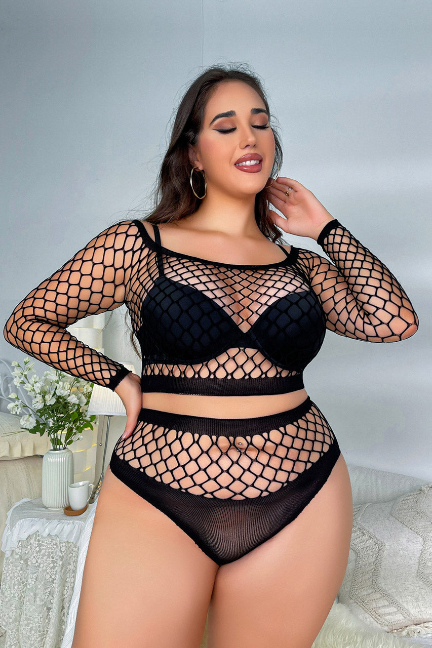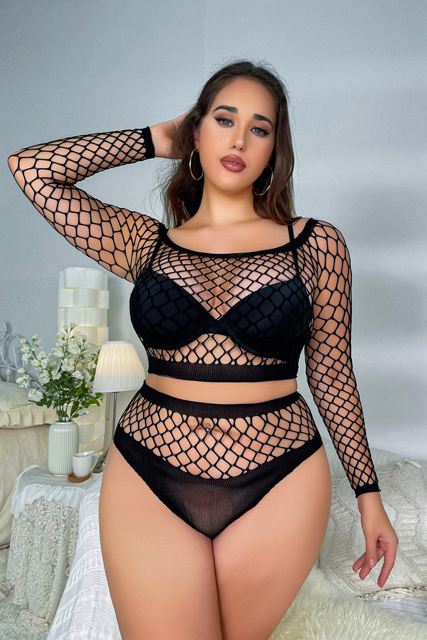 Allure audacieuse et ajustement parfait avec cet ensemble résille grande taille crop top et culotte taille haute. Le crop top à manches longues joue sur la transparence et la robustesse de la maille, tandis que la culotte taille haute offre un maintien flatteur et un confort durable. Confectionné en partie avec des fibres professionnelles importées d’Amérique, ce duo propose une résistance optimale et une coupe pensée pour les courbes généreuses.