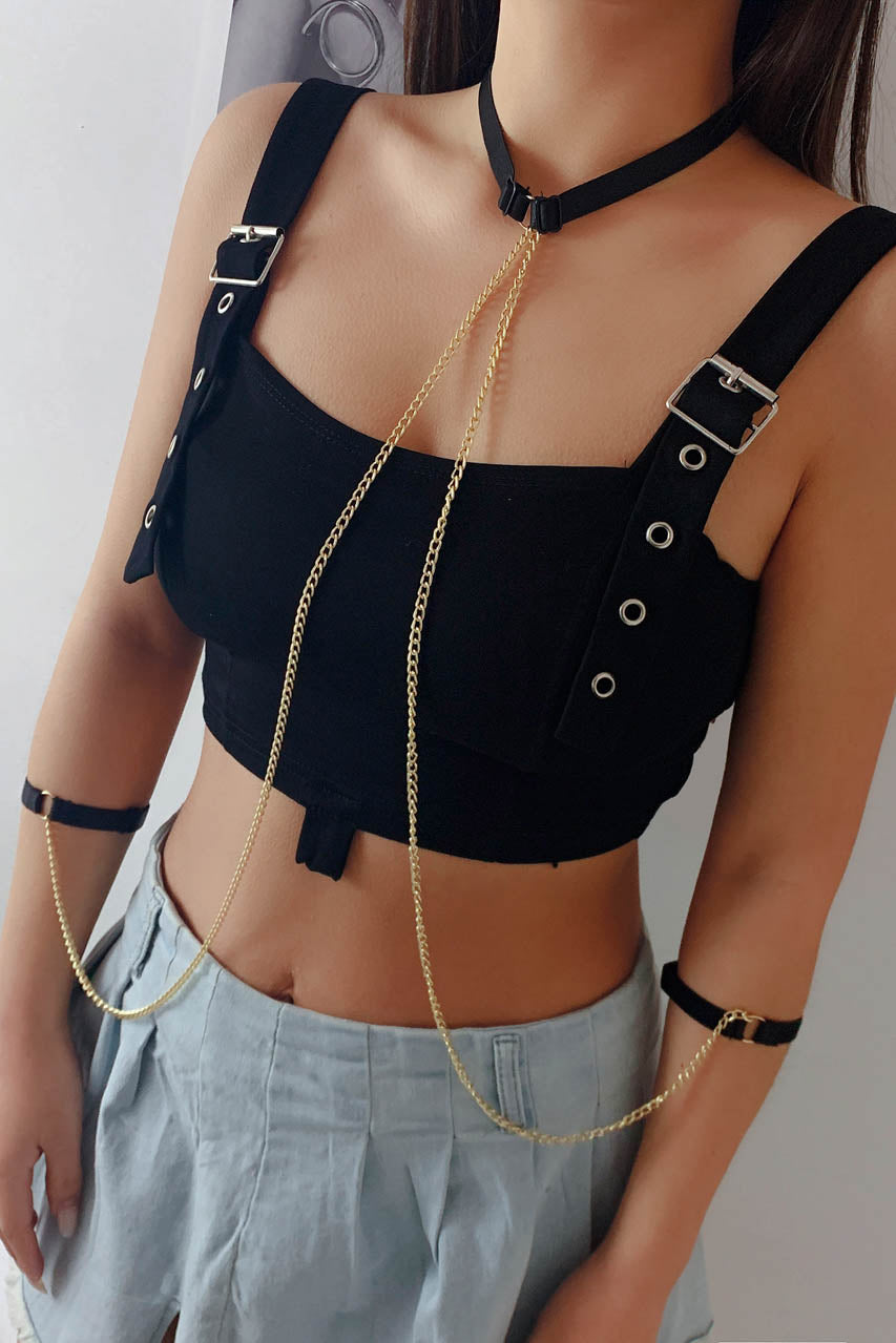 Le harnais chaîne corps et menottes offre un maintien ferme tout en épousant les contours du buste. La finition dorée ajoute une touche élégante sans compromettre la robustesse. Les menottes intégrées augmentent l’aspect fonctionnel du design. L’ajustement global se fait via des sangles fines et discrètes.