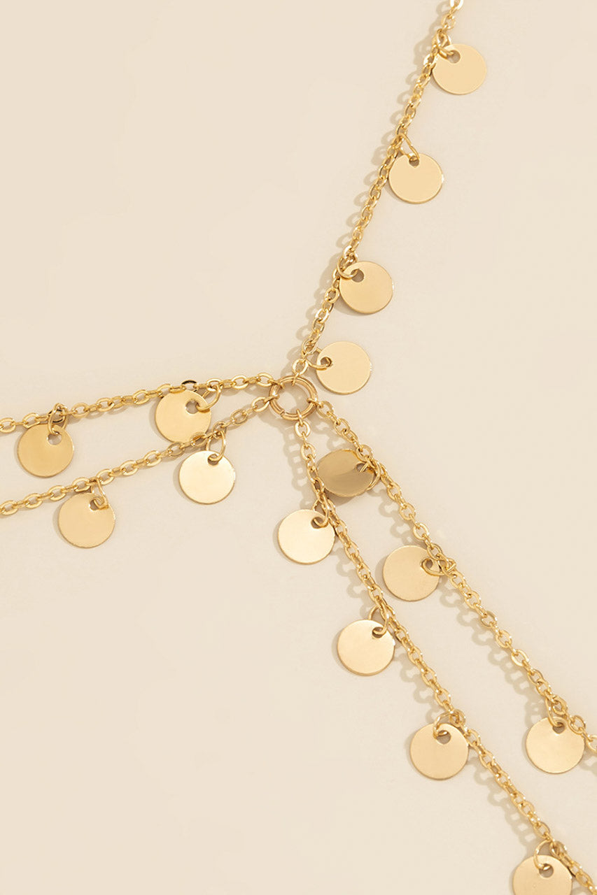 Les détails de pièces de monnaie confèrent une élégance discrète à ce harnais drapé. Sa coupe épouse les formes sans gêner les mouvements. Chaque maillon est soudé pour garantir une haute résistance au port quotidien.