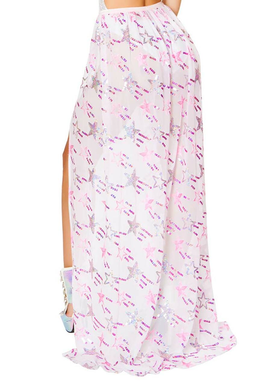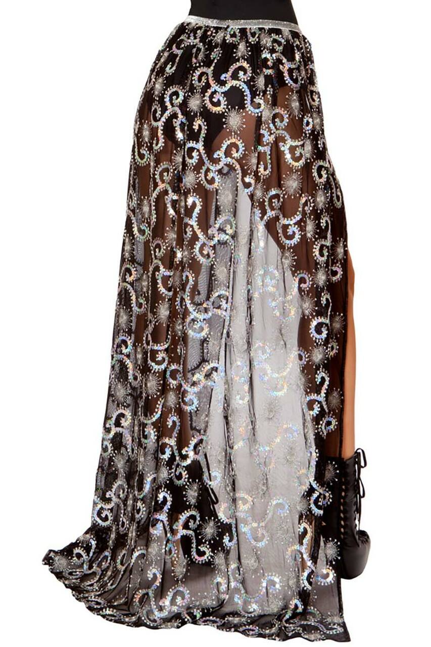 Le tissu noir transparent met en valeur le motif de sequins argentés qui jalonne toute la surface de la jupe.