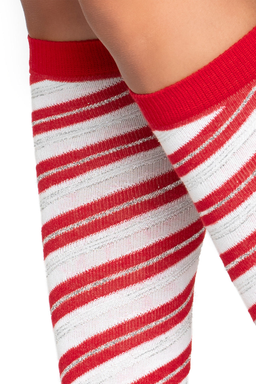Chaque bas hypnotise grâce à ses bandes rouges et blanches inspirées de la canne à sucre. La texture souple épouse les jambes sans serrer. Les fils métallisés apportent un éclat discret sous les éclairages.