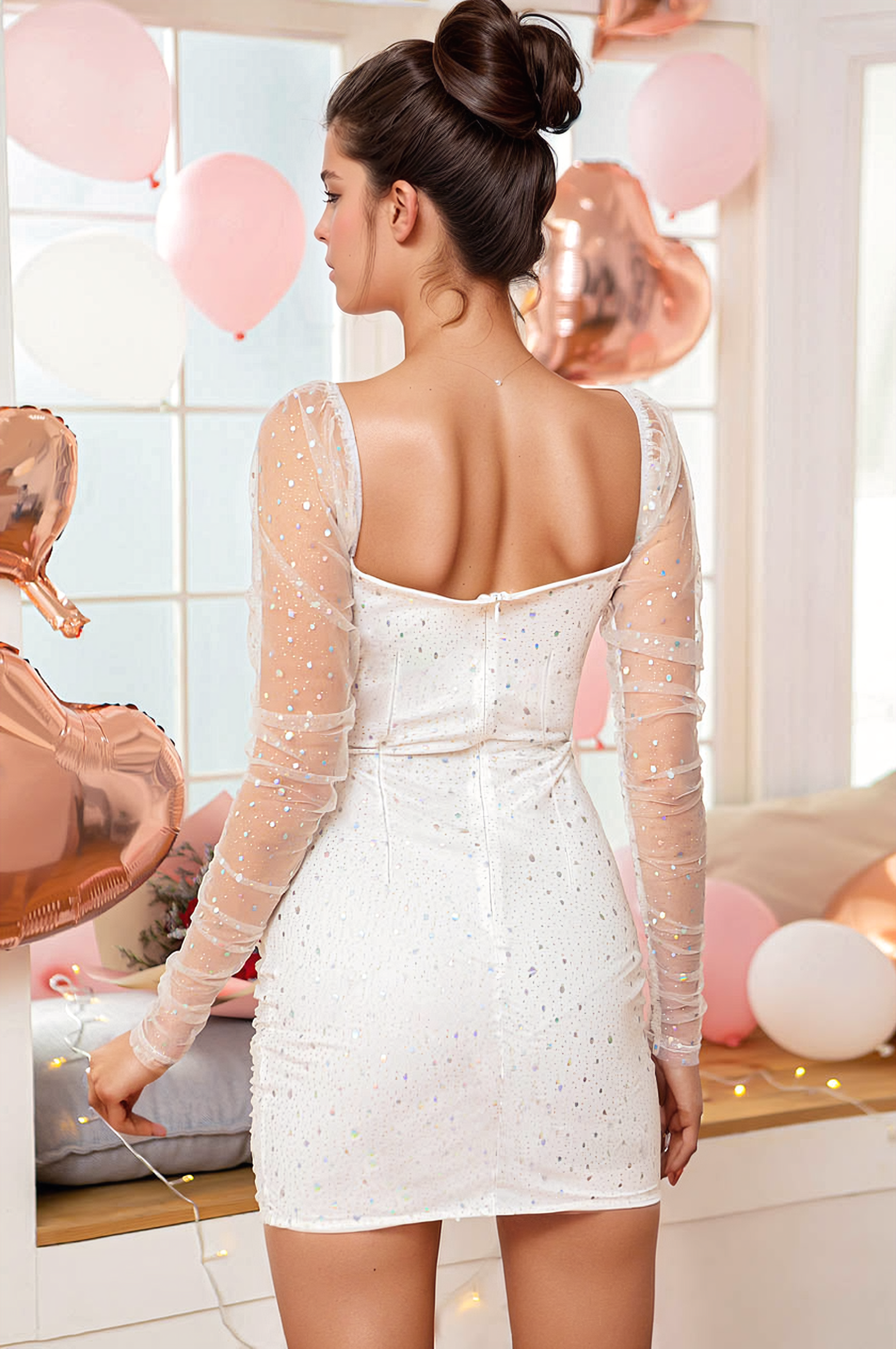 Cette mini robe blanche à perles associe un mesh délicat à des manches longues épaules dénudées pour une silhouette romantique et contemporaine.