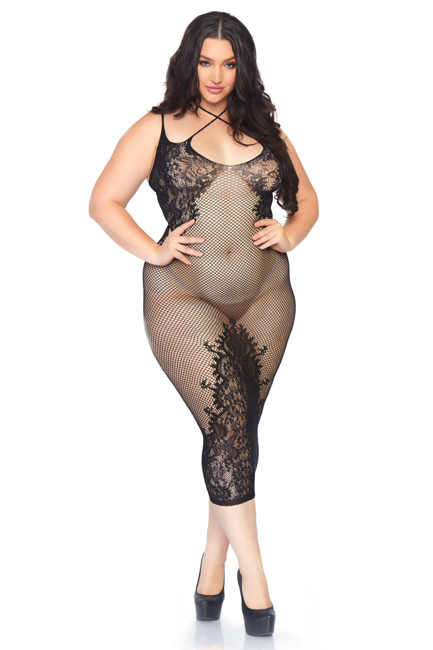La nuisette résille et dentelle grande taille noire combine dentelle florale et résille transparente pour une tenue harmonieuse. Son tissu extensible épouse les formes tout en laissant respirer la peau.