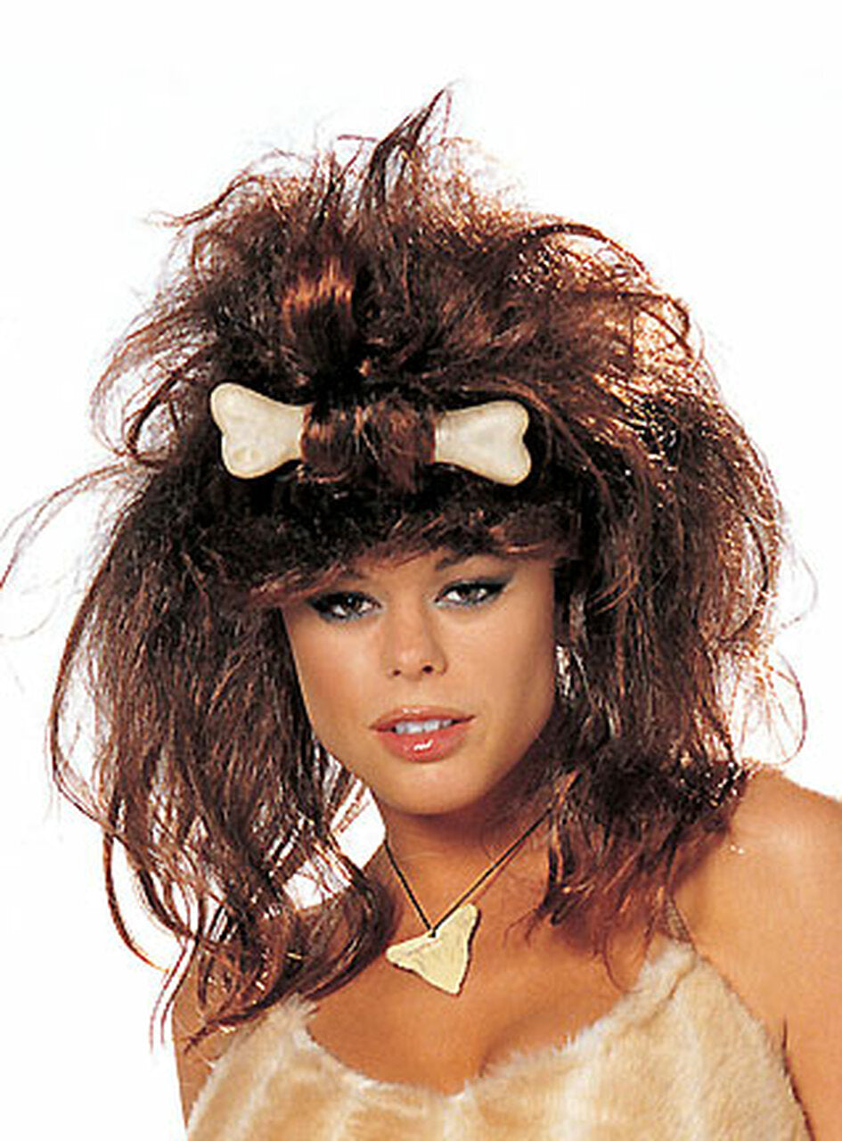 Inspirée de l’époque de la préhistoire, cette perruque se distingue par ses mèches crêpées et son chignon haut orné d’un faux os, pour un rendu authentique.